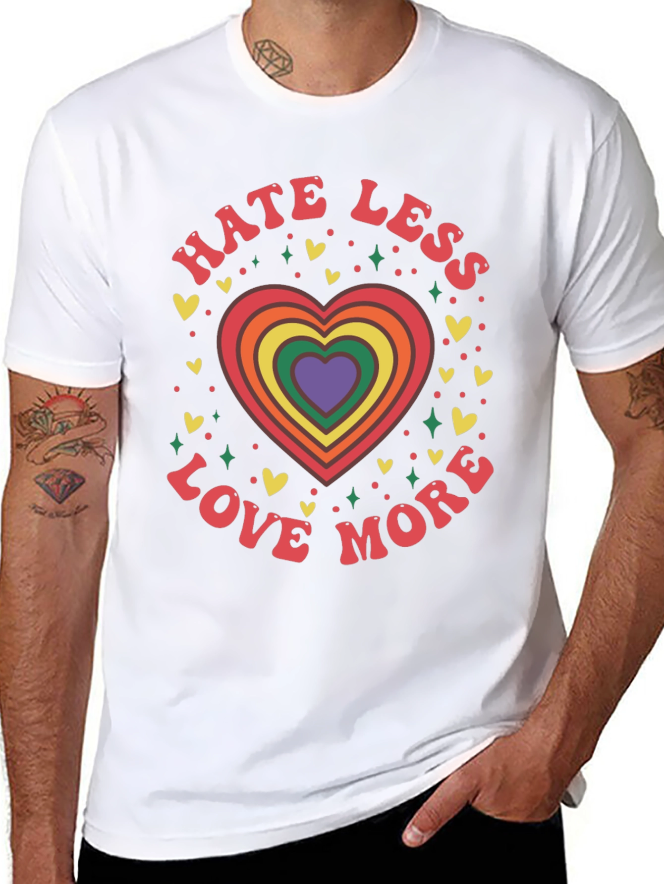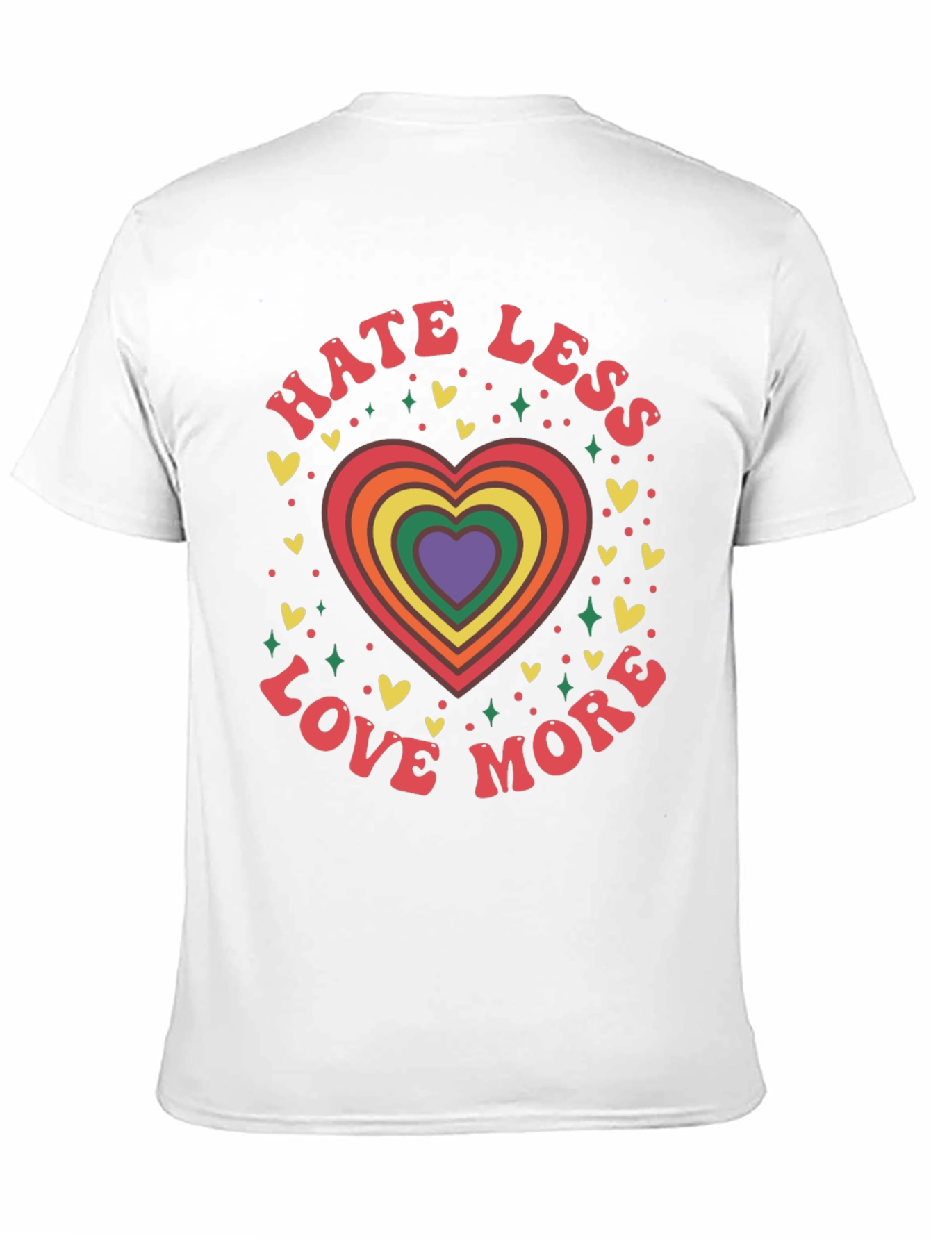 Spread positivity with this retro-inspired graphic tee! This black t-shirt features a vibrant heart design composed of rainbow layers, surrounded by sparkling stars and mini hearts. The catchy phrase "Hate Less Love More" is emblazoned in bold red letters. Perfect for casual wear, Pride events, or simply making a statement, this tee is crafted for comfort and style. It is made with a soft, breathable fabric. Show your support for love and acceptance with this unique and eye-catching design.