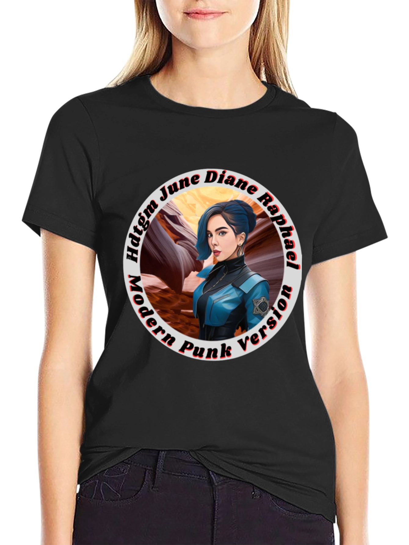 Show off your unique style with this eye-catching black t-shirt. Featuring a vibrant, circular graphic showcasing an artistic depiction of June Diane Raphael in a modern punk version, framed by bold lettering. This t-shirt is perfect for fans and fashion-forward individuals alike. Made from comfortable materials, it’s ideal for everyday wear, casual outings, or making a statement at your next event. Get yours today and turn heads with this unique t-shirt!