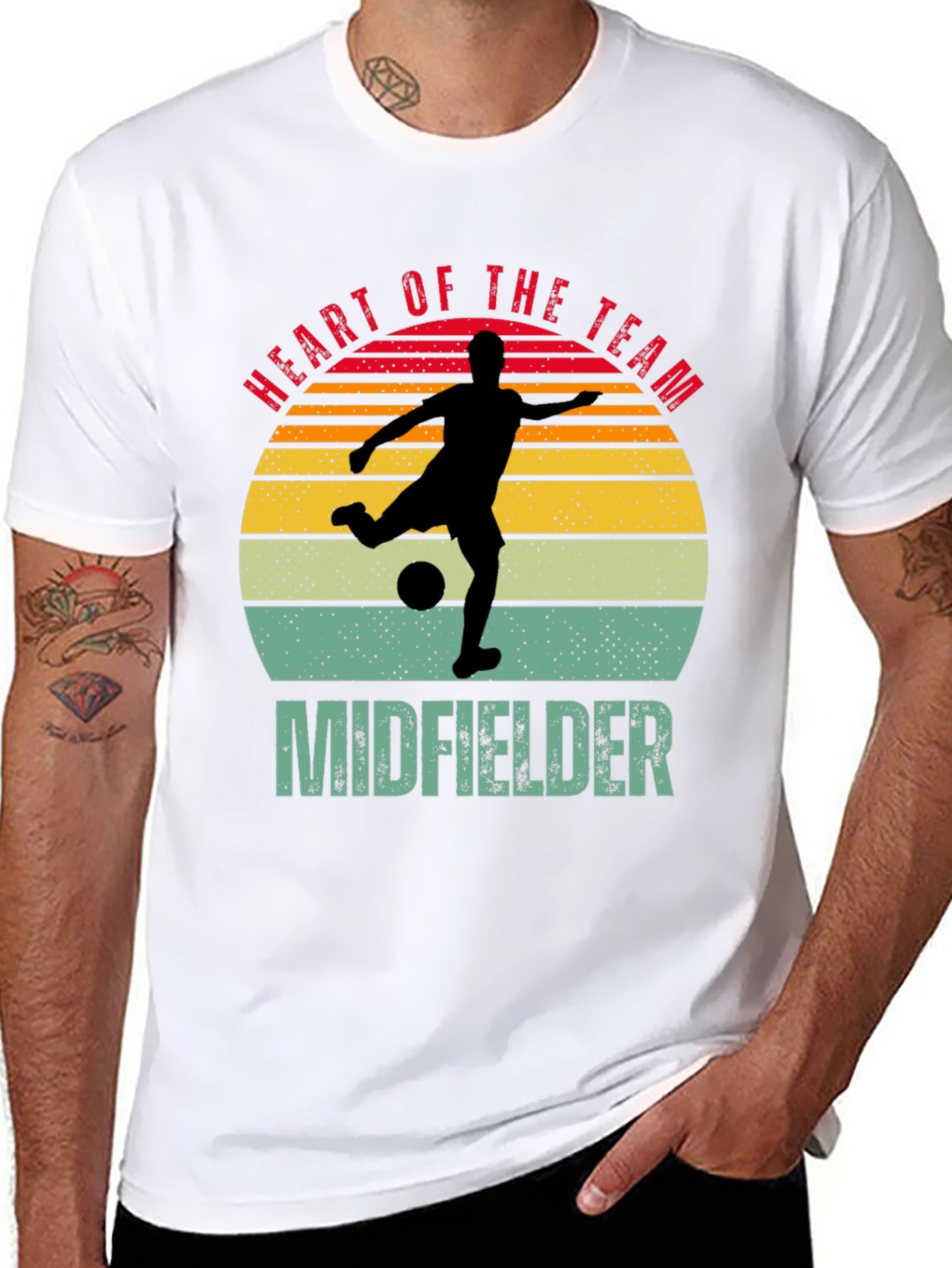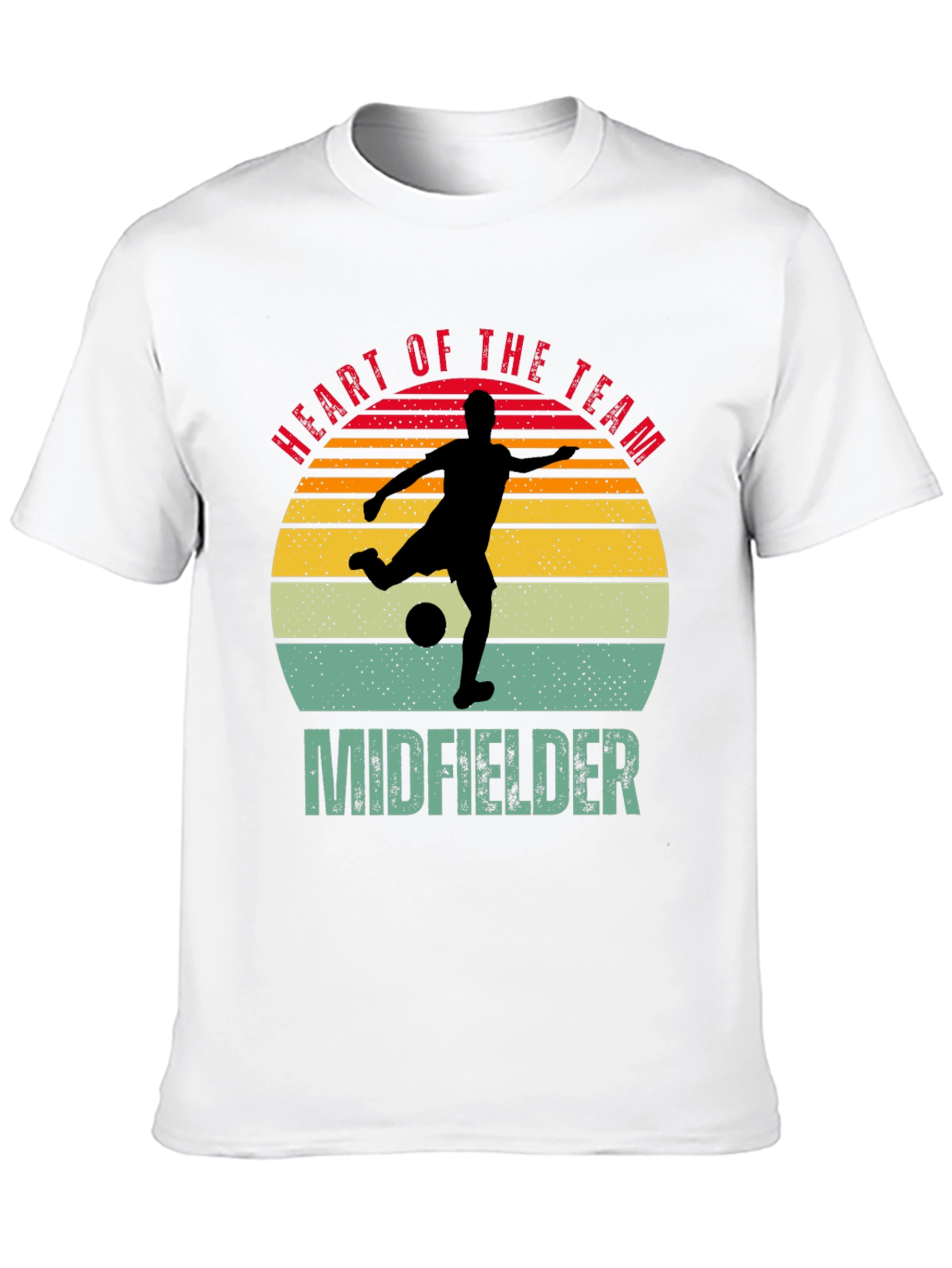 Show your love for the beautiful game with this unique soccer t-shirt. This black tee features a retro-style graphic with a player silhouetted against a striped sunset backdrop. The words "HEART OF THE TEAM" arc across the top, while "MIDFIELDER" sits boldly at the bottom. Perfect for soccer players, fans, or anyone who appreciates vintage-inspired designs. Made from comfortable materials, this t-shirt is ideal for casual wear, training sessions, or supporting your favorite team from the stands. A great gift for soccer enthusiasts!