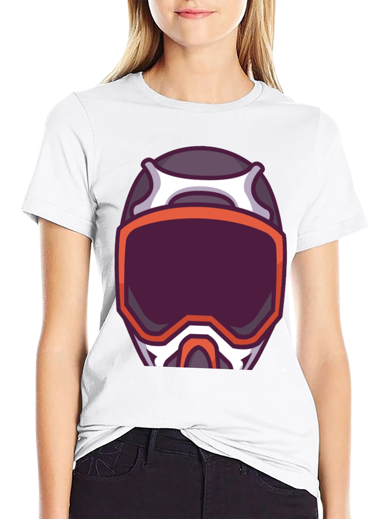 This stylish black t-shirt features a bold graphic print of a stylized helmet, perfect for those with an adventurous spirit or a love for extreme sports aesthetics. The design incorporates a striking color palette with shades of purple, white, and orange, creating a visually appealing contrast against the dark fabric. Made from a soft, breathable material, this tee ensures a comfortable fit for everyday wear. Ideal for casual outings, sporting events, or simply expressing your unique style, this helmet graphic tee is a versatile addition to any wardrobe. Show off your passion with this eye-catching and comfortable shirt!