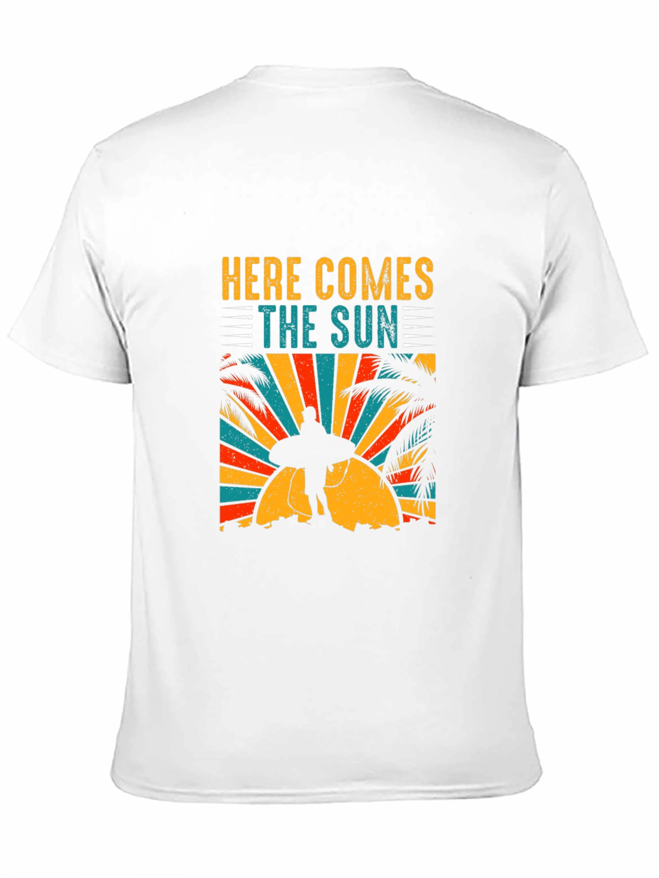Embrace the warmth with this stylish black graphic tee. The design features a retro sunset scene with palm trees and a surfer silhouette, accompanied by the text "Here Comes The Sun." The vibrant colors and vintage aesthetic give it a cool, relaxed vibe. Made from a comfortable, breathable fabric, this tee is perfect for casual outings, beach days, or simply adding a touch of summer to your everyday look. Pair it with jeans, shorts, or your favorite beach attire for a laid-back, effortlessly stylish ensemble. A must-have for anyone who loves the sun, surf, and good vibes.
