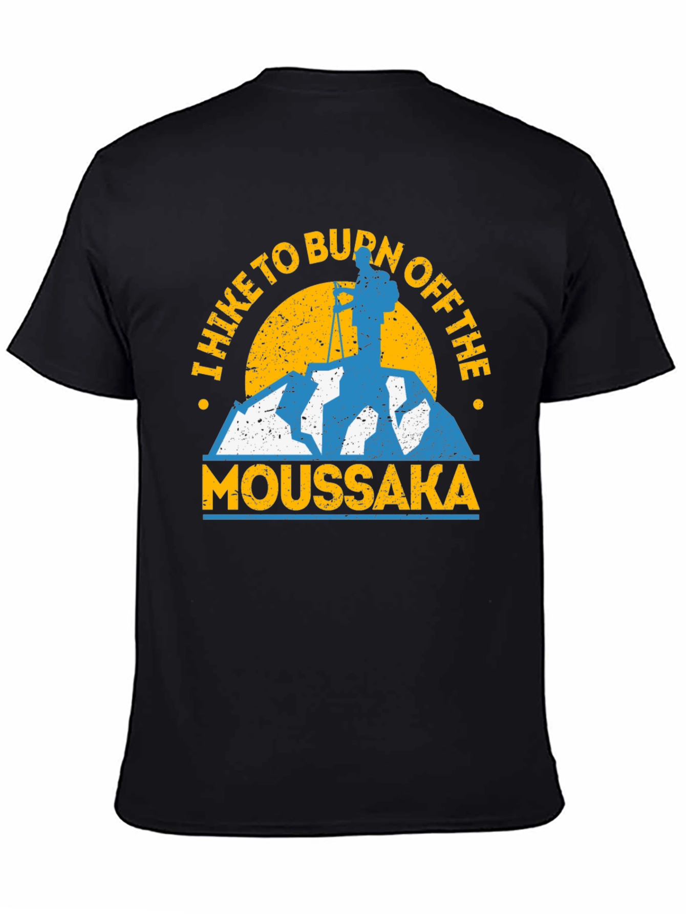 This stylish black t-shirt features a unique graphic design perfect for hiking enthusiasts and food lovers alike. The design includes a stylized illustration of a mountain climber against a textured yellow sun, with the humorous text "I HIKE TO BURN OFF THE MOUSSAKA" arranged around it. The graphic uses a blue and white color scheme for the mountain and climber, making it pop against the black background. Made from a comfortable fabric, this tee is ideal for casual wear, outdoor adventures, or as a fun gift for someone who enjoys both hiking and delicious Greek cuisine. Stand out from the crowd with this playful and eye-catching design!