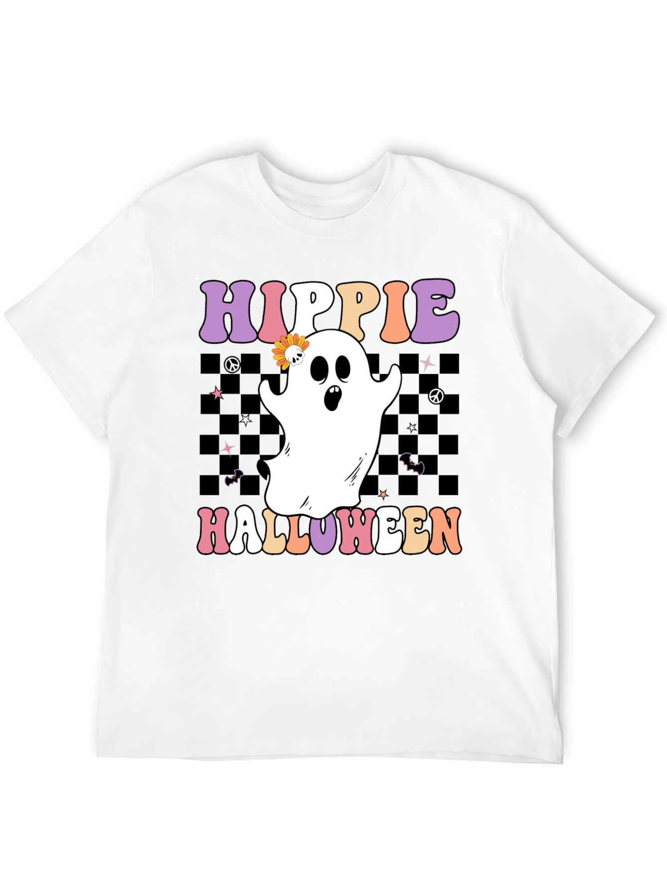 Get ready for a groovy Halloween with this unique t-shirt! This black tee features a retro-inspired design with the words "Hippie Halloween" in a fun, wavy font. At the center, a charming ghost graphic adorned with a flower adds a touch of spooky-chic. The checkered background and whimsical bat and peace sign accents complete the look. Perfect for Halloween parties, casual outings, or anyone who loves a vintage vibe with a spooky twist. This comfortable tee is sure to turn heads and spread positive vibes.