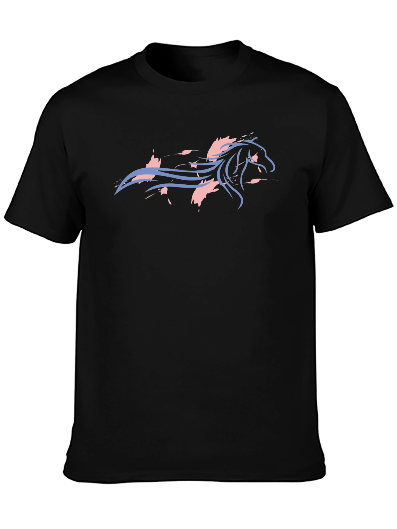 Show off your unique style with this eye-catching black t-shirt. Featuring a stylized horse graphic in cool blue and pink tones, this tee is sure to turn heads. The design offers a modern and artistic touch, perfect for those who appreciate equestrian themes or unique designs. Made from a comfortable, breathable fabric, this shirt is ideal for everyday wear. Dress it up with a jacket or keep it casual with jeans. A must-have addition to any wardrobe, this tee makes a great gift for horse lovers and fashion enthusiasts alike.