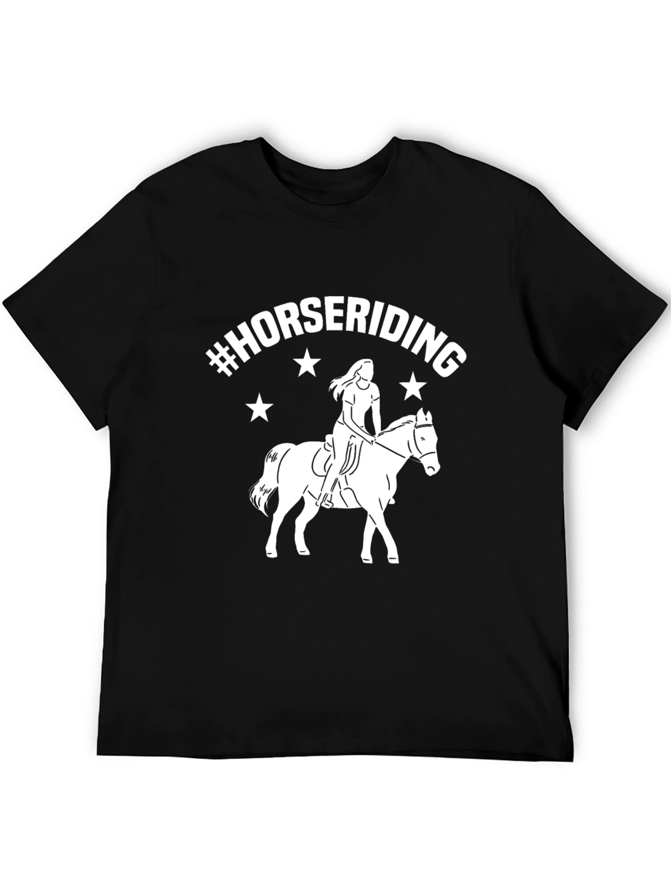 Show off your love for equestrian sports with this stylish black t-shirt. Featuring a bold "#HORSERIDING" graphic encircled by stars above a silhouetted rider on horseback, this tee is perfect for casual wear. The design is clean, modern, and makes a statement. Made from what appears to be a soft, comfortable fabric, this t-shirt is ideal for everyday wear, trips to the stable, or simply expressing your passion for horses. Its classic fit ensures a flattering silhouette, and the durable construction suggests it will withstand regular washing. Get yours today and ride in style!