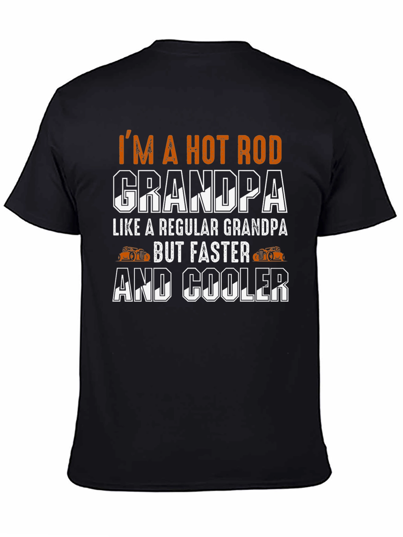 Show off your love for hot rods and being a grandpa with this unique t-shirt. The black tee features the phrase "I'M A HOT ROD GRANDPA LIKE A REGULAR GRANDPA BUT FASTER AND COOLER". The graphic includes a vintage hot rod design. Made from a comfortable, breathable material, this shirt is perfect for casual wear, car shows, or family gatherings. A great gift for any gearhead grandpa who wants to stand out from the crowd. Get yours today and let everyone know you're not just any grandpa, you're a hot rod grandpa!