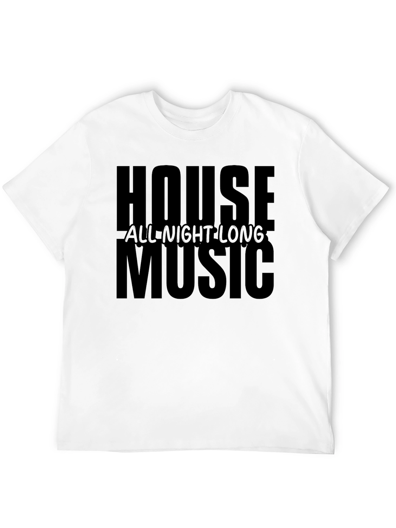 Show your love for house music with this stylish black t-shirt. The tee features a bold, eye-catching "HOUSE ALL NIGHT LONG MUSIC" graphic printed across the chest. Made from a soft, comfortable fabric, this shirt is perfect for everyday wear or for hitting the club. Its classic fit and dark color make it versatile and easy to pair with any outfit. Whether you're a DJ, a dancer, or simply a fan of house music, this t-shirt is a must-have addition to your wardrobe. Get ready to groove all night long in this awesome tee!