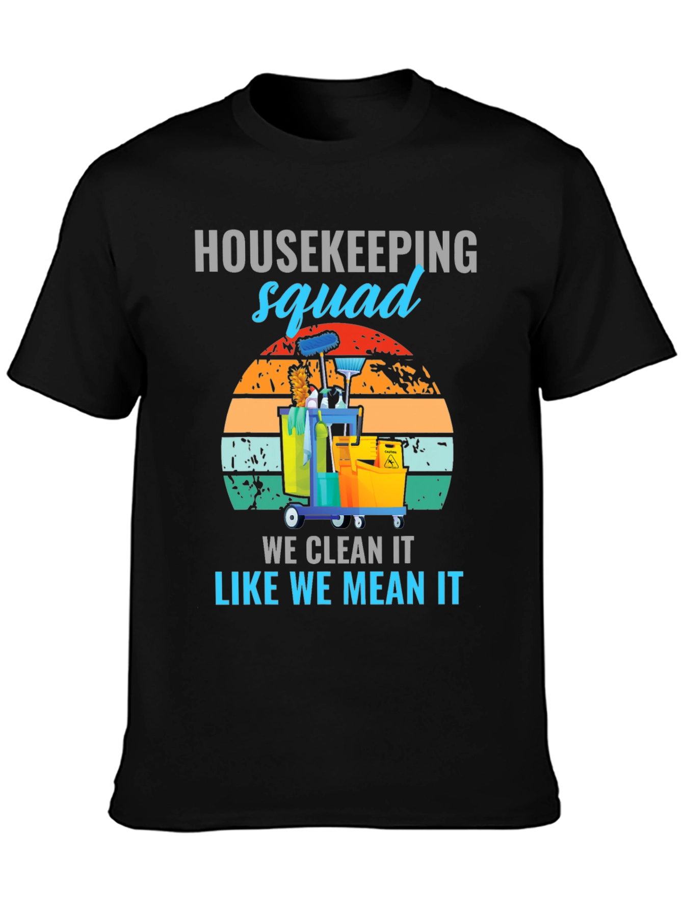 Show off your cleaning prowess with this stylish "Housekeeping Squad" t-shirt! This black tee features a vibrant graphic design including cleaning supplies on a janitorial cart in front of a retro sunset backdrop. The bold text "WE CLEAN IT LIKE WE MEAN IT" adds a playful touch. Perfect for professional cleaners, housekeepers, or anyone who takes pride in a spotless home. The classic fit and comfortable fabric make it ideal for everyday wear. Makes a great gift for your cleaning team or the neat freak in your life! Add this unique t-shirt to your wardrobe today.
