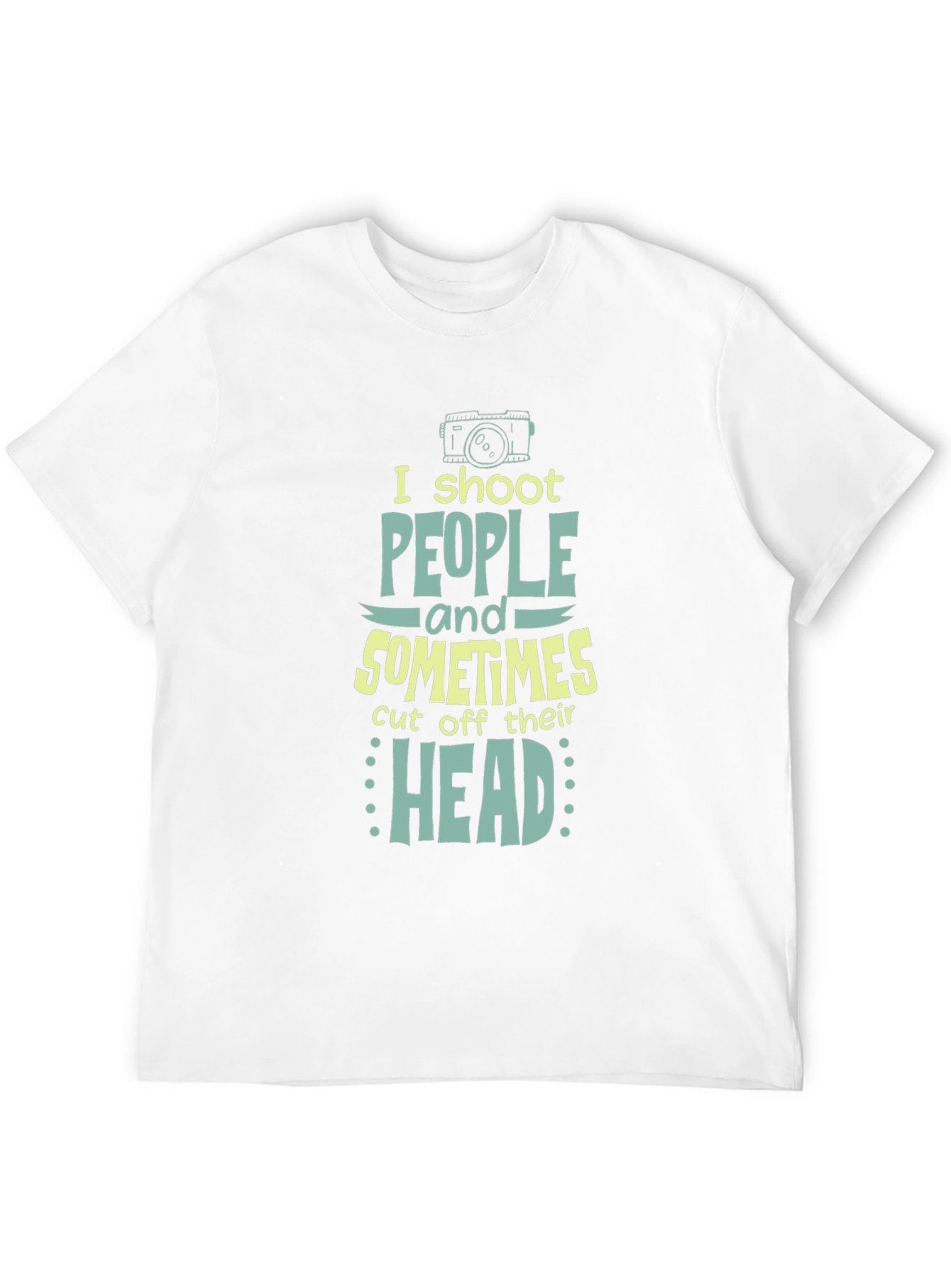 This black t-shirt features a funny graphic print for photography enthusiasts. The design includes a retro-style camera image, accompanied by the playful text "I shoot PEOPLE and SOMETIMES cut off their HEAD". The print is in a teal and yellow color scheme. Made from what appears to be a soft and comfortable material, this tee offers a relaxed fit suitable for everyday wear. It’s a great conversation starter and perfect for casual outings, photography events, or simply showcasing your love for photography with a touch of humor. Get yours today and share a laugh!