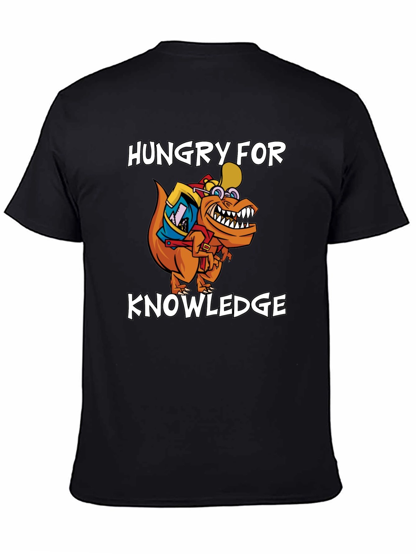 Show off your love for learning with this unique black T-shirt! The shirt features a vibrant, cartoon-style illustration of an orange dinosaur wearing glasses and a backpack, humorously declaring it's "Hungry For Knowledge." Made from comfortable, breathable fabric, this tee is perfect for students, teachers, and anyone with a passion for education. Whether you're heading to class, the library, or just hanging out, this eye-catching shirt is sure to spark conversations and showcase your intelligence with a touch of whimsy. Get yours today and wear your curiosity on your sleeve!