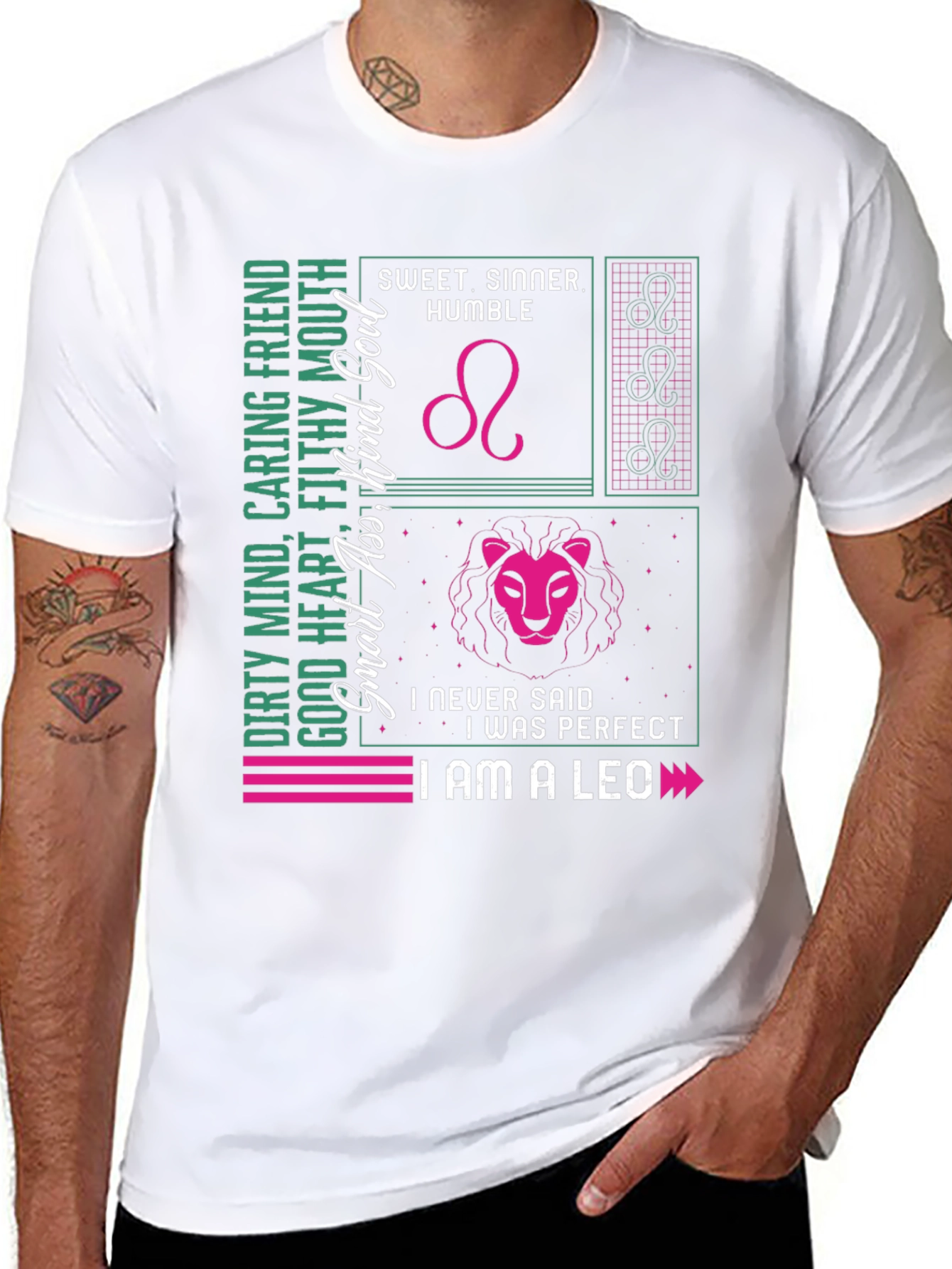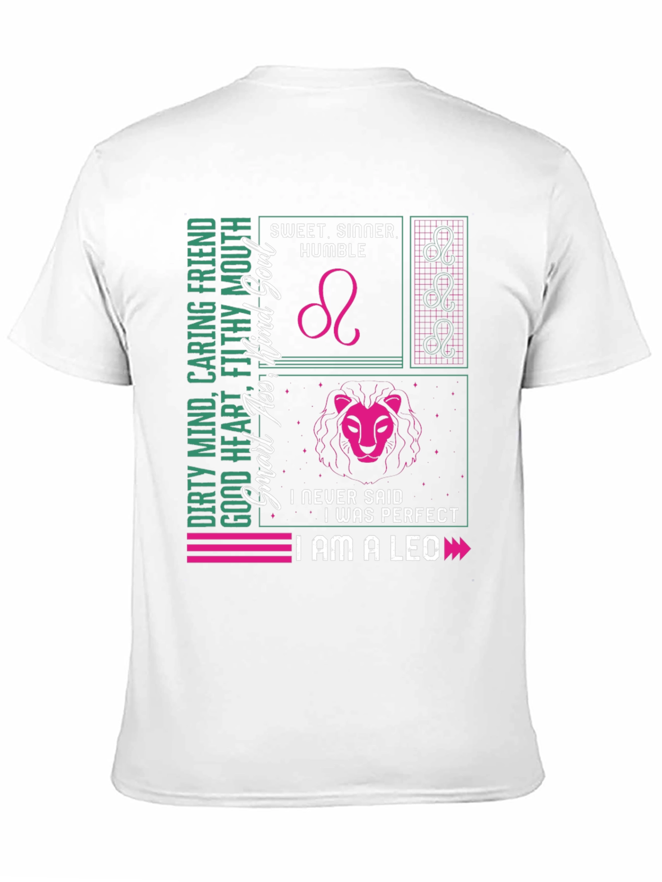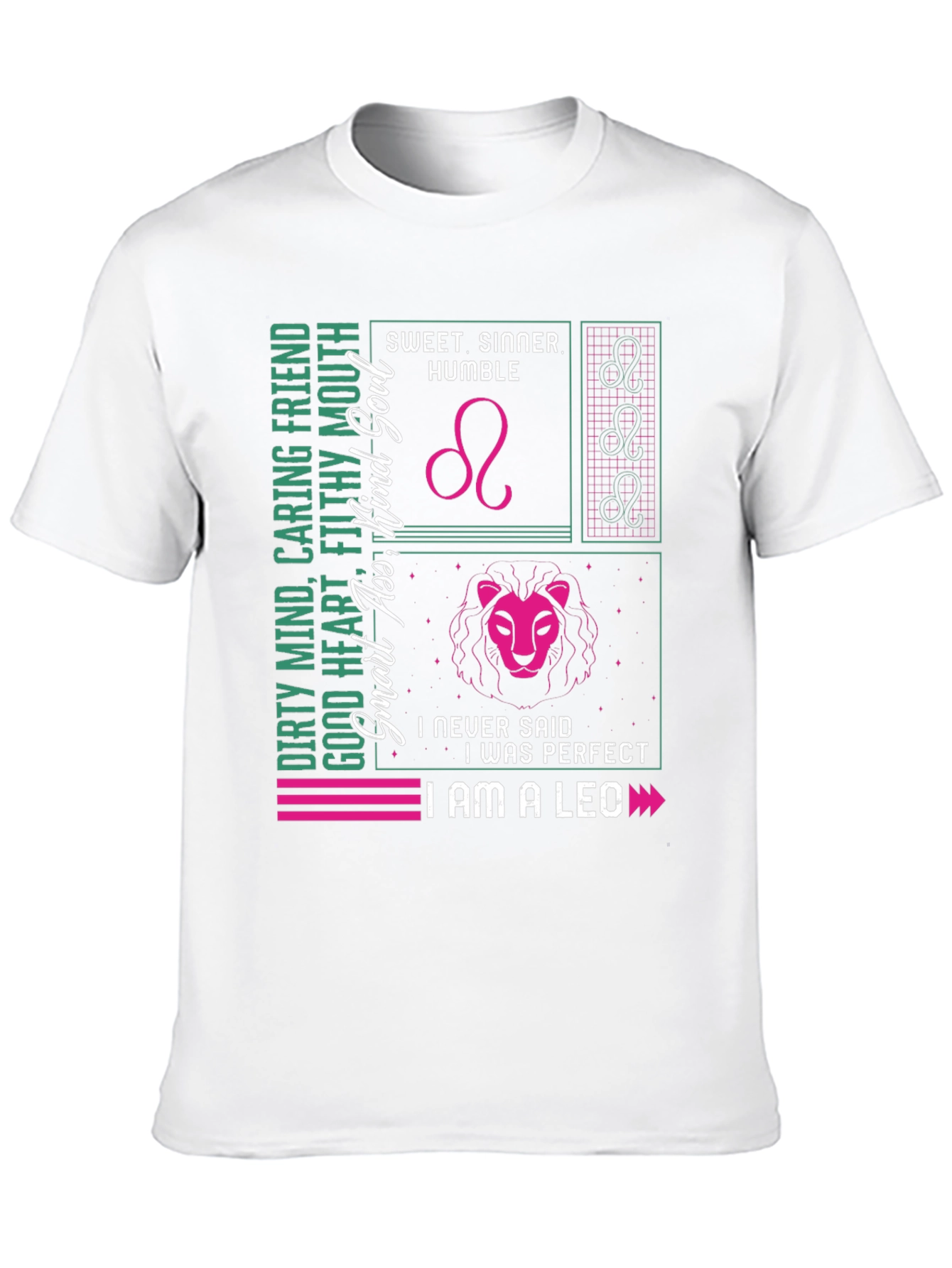 This black T-shirt features a unique and eye-catching design for Leo zodiac sign enthusiasts. The print includes the Leo symbol and an illustration of a lion, accompanied by phrases like "Sweet Sinner, Humble," "I Never Said I Was Perfect," and "I am a Leo." Additional text along the side lists qualities such as "Dirty Mind, Caring Friend" and "Good Heart, Filthy Mouth." The design is printed in vibrant shades of pink and green, contrasting beautifully against the black backdrop. Perfect for casual wear, this shirt is a great way to show off your astrological pride and make a bold statement. It's comfortable, stylish, and sure to spark conversations.