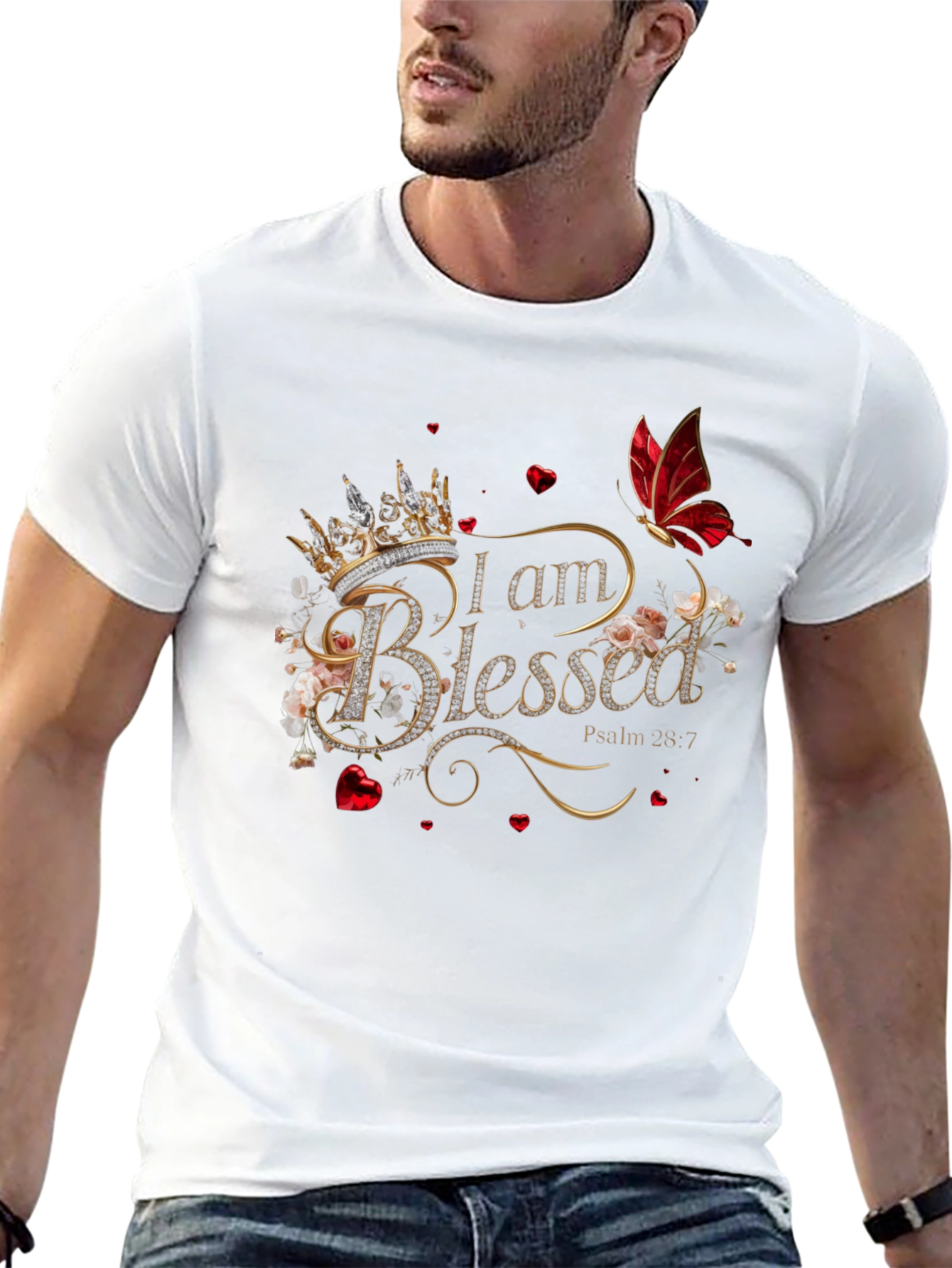 Show your faith with this stylish black t-shirt. It features an elegant "I am Blessed" design, incorporating a jeweled crown, delicate floral accents, a vibrant red butterfly, and the scripture reference "Psalm 28:7." The gold swirls add a touch of elegance. This shirt is perfect for everyday wear, church gatherings, or as a thoughtful gift for someone special. Express your beliefs with this eye-catching and comfortable tee!