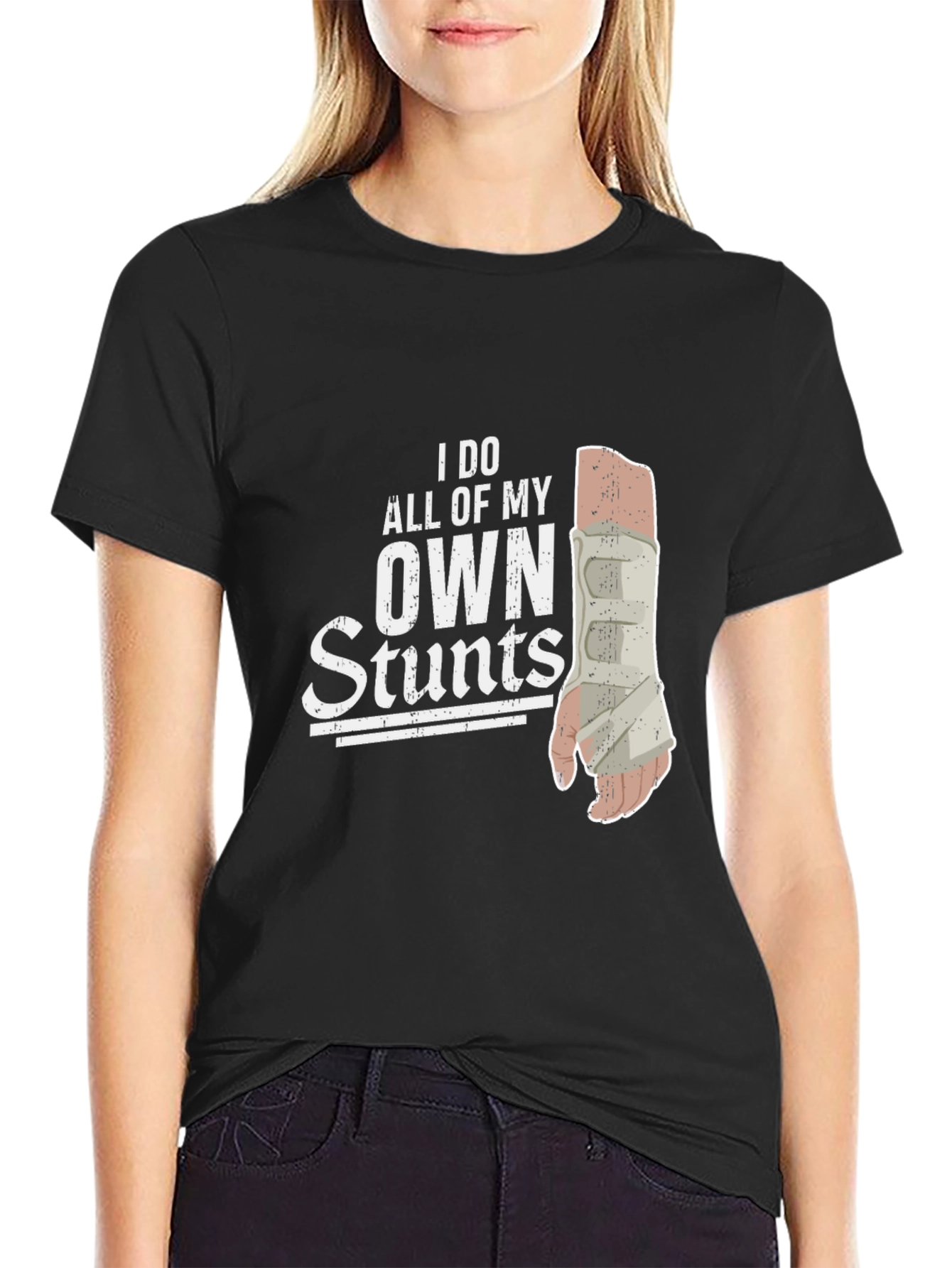 This black t-shirt features a humorous design for those who embrace life's bumps and bruises. The graphic showcases the phrase "I DO ALL OF MY OWN Stunts" with a visual of a person's arm in a medical cast. This tee is perfect for individuals with a quirky sense of humor and a story to tell. Made from soft and breathable fabric, it ensures all-day comfort whether you're recovering from an injury or just making a statement. Wear it proudly to casual outings, parties, or as a conversation starter. Great gift idea for friends and family who have a knack for stunts, both intentional and otherwise.
