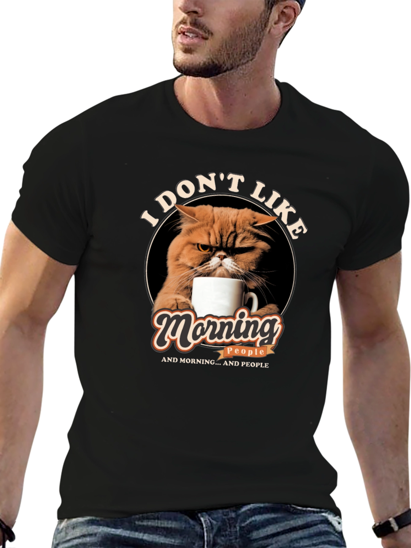 Show your disdain for mornings with this humorous graphic t-shirt. Featuring a grumpy-looking Persian cat holding a coffee mug, this tee is perfect for anyone who relates to the sentiment 'I DON'T LIKE MORNING...AND MORNING...AND PEOPLE.' The design is printed on a black, short-sleeved tee, making it versatile for everyday wear. Made from a comfortable fabric, this shirt is ideal for casual outings, lounging at home, or as a fun gift for the anti-morning person in your life. Express your personality with this unique and relatable t-shirt.