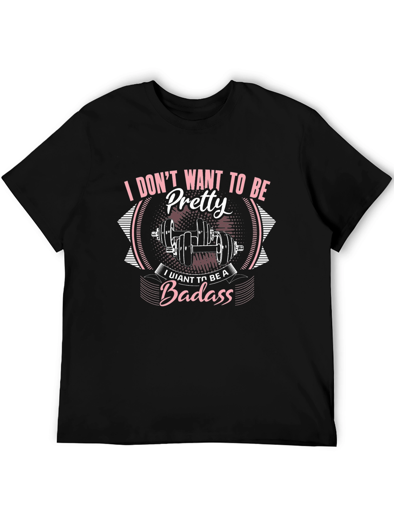 Show off your strength with this bold black graphic t-shirt. Featuring a unique design with the words 'I Don't Want To Be Pretty, I Want To Be A Badass', this shirt is perfect for anyone who embraces their inner power. The design includes dumbbell graphic, adding a sporty touch. Crafted from a soft and comfortable fabric, this short-sleeved tee offers a relaxed fit for all-day wear. Ideal for workouts, casual outings, or making a statement wherever you go, this t-shirt combines style and empowerment.