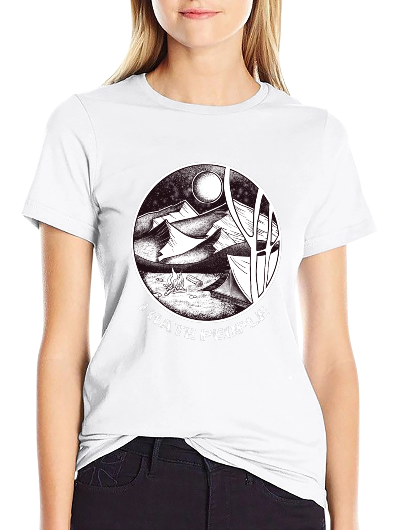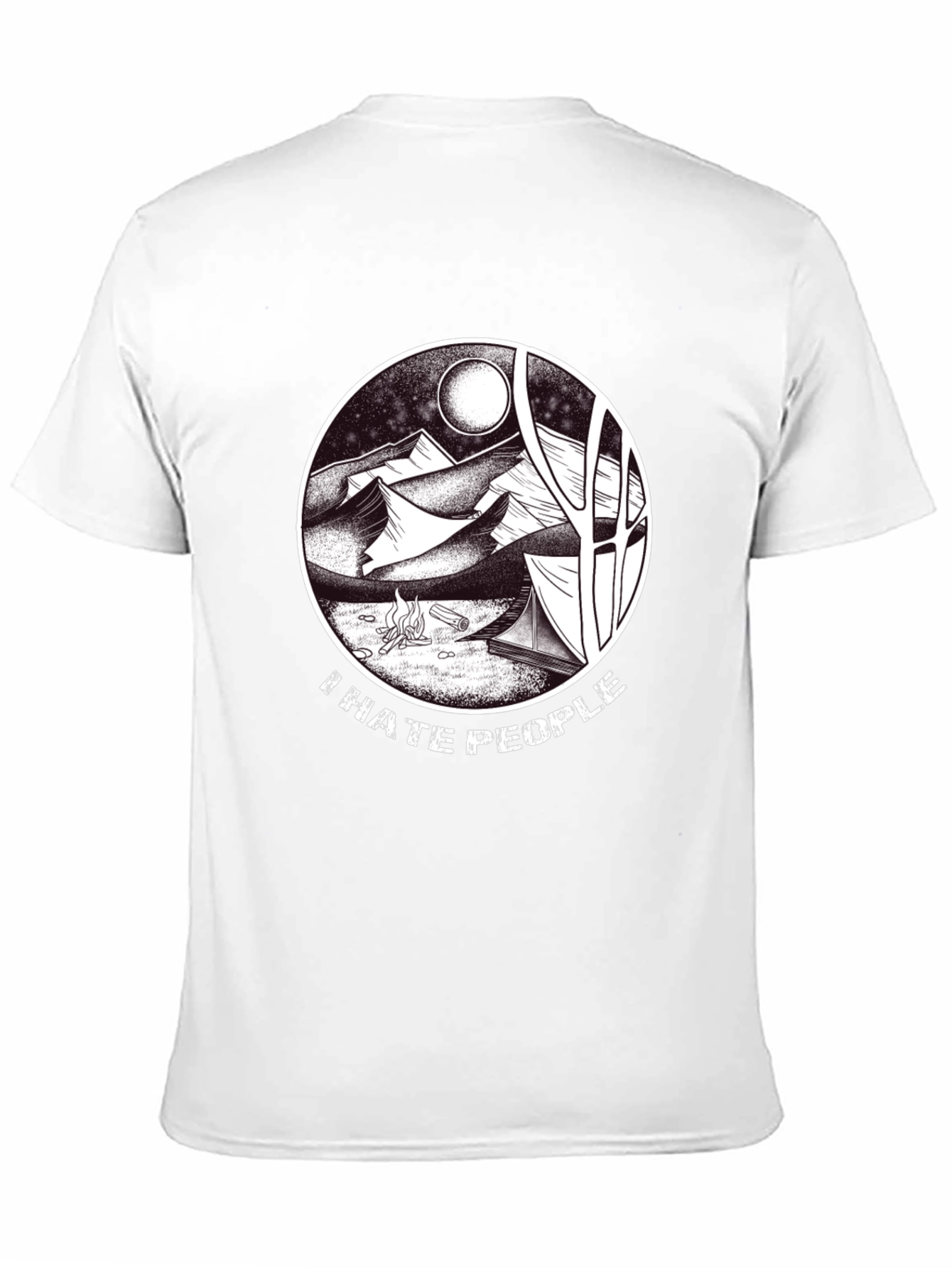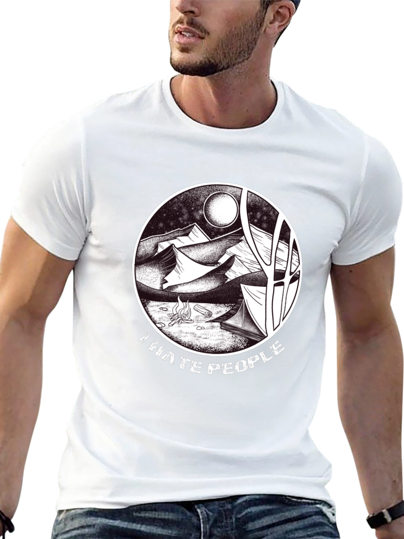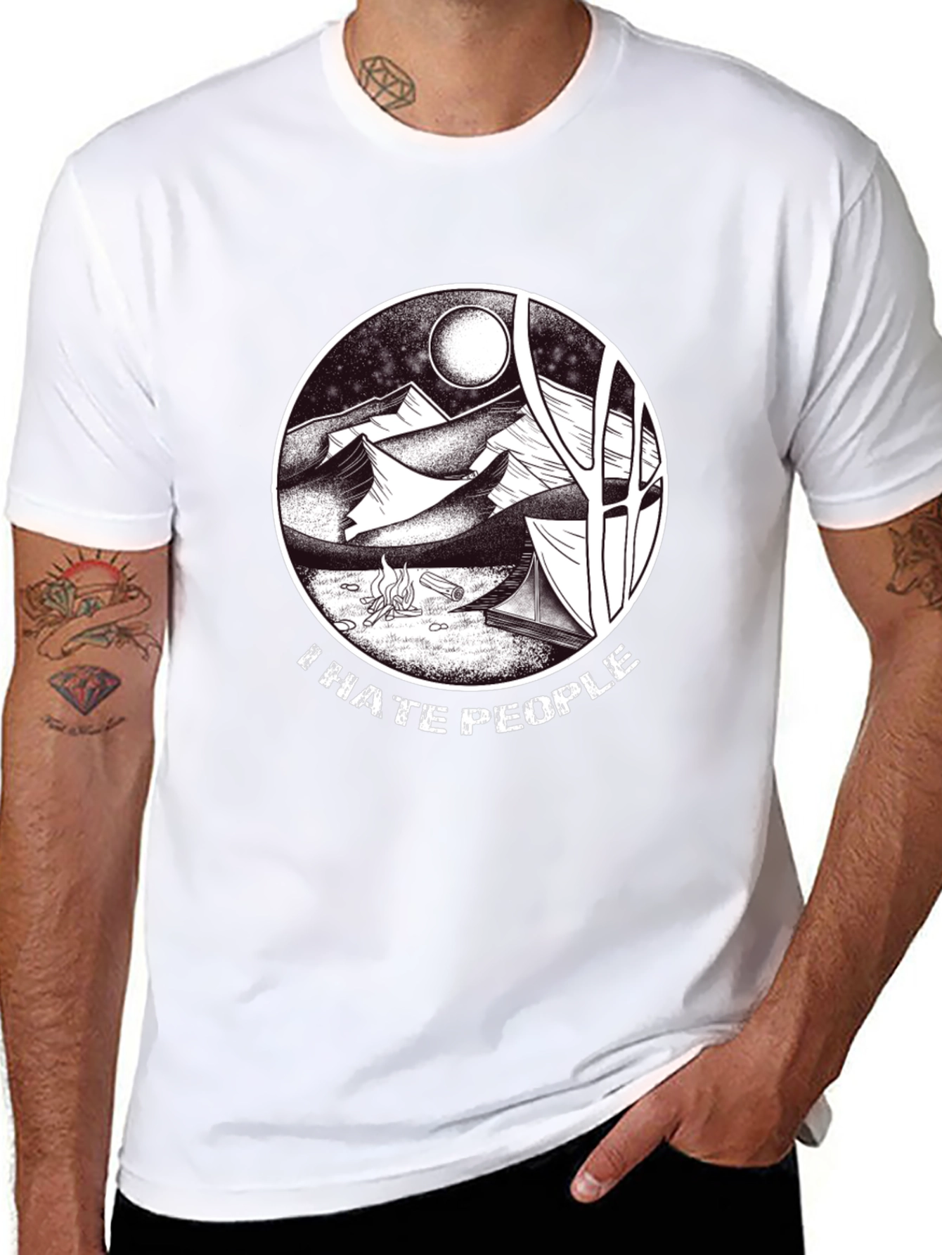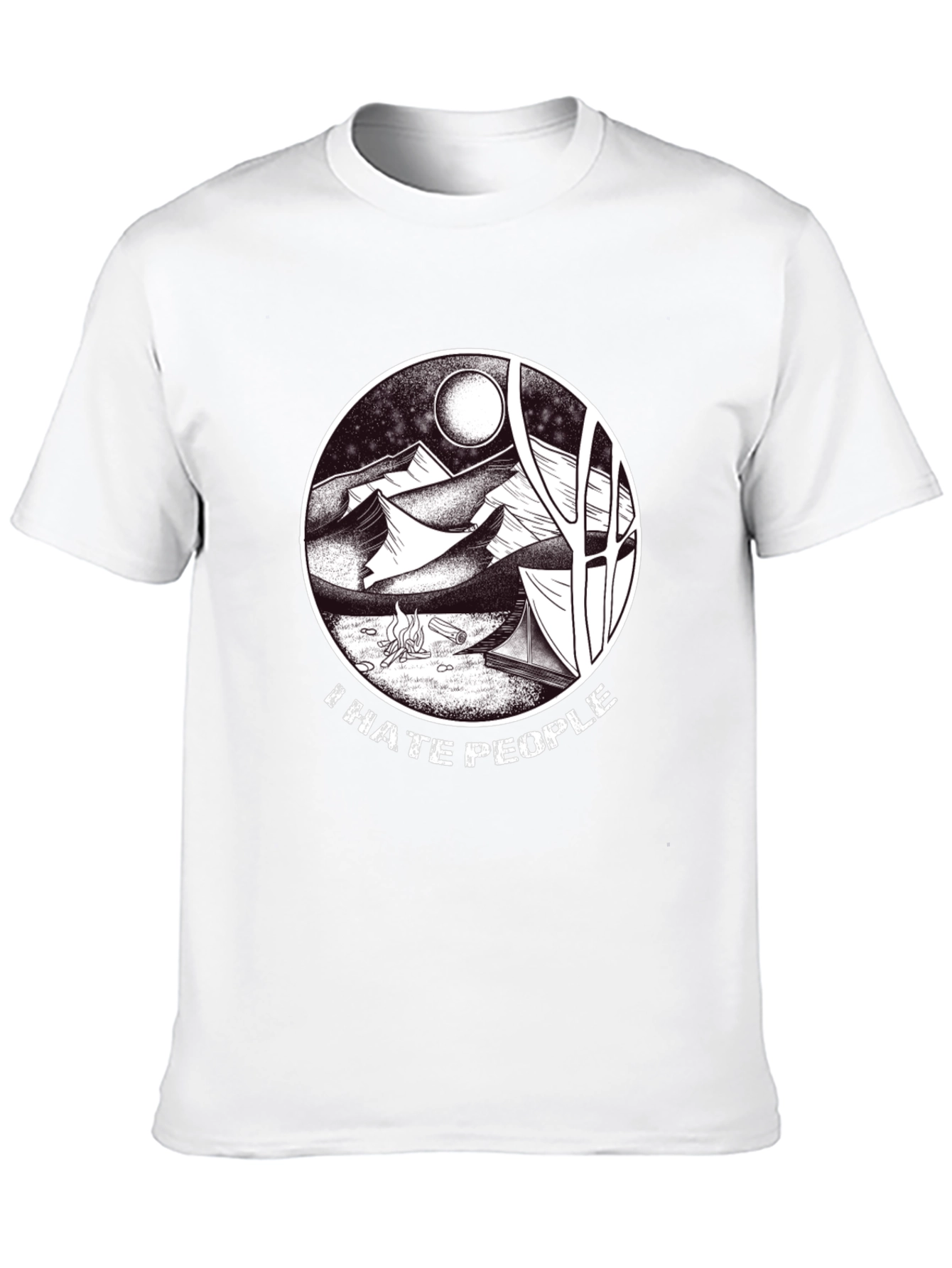 Embrace your love for the outdoors with this unique "I Hate People" camping t-shirt. This stylish black tee features a captivating circular graphic design showcasing a serene mountain landscape with a tent, campfire, and moonlit night sky. The bold "I HATE PEOPLE" text adds a touch of humor. Made from comfortable, breathable fabric, this shirt is perfect for camping trips, hiking adventures, or simply expressing your introverted side. Stand out from the crowd and let your apparel reflect your passion for nature and solitude. Ideal for casual wear, outdoor activities, or as a gift for the nature enthusiast in your life.