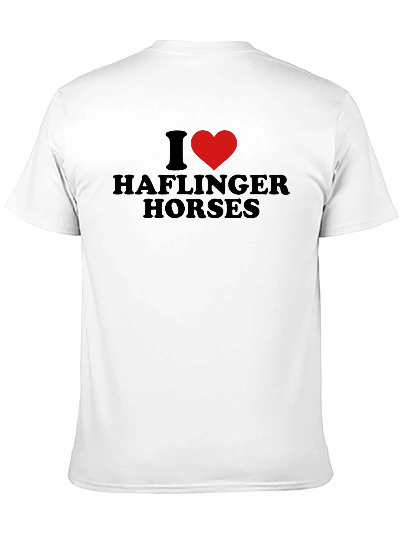 Show your love for Haflinger Horses with this stylish and comfortable black graphic tee. This classic t-shirt features a bold "I (Heart) Haflinger Horses" design, making it perfect for equestrian enthusiasts. Made from soft, breathable fabric, this tee is ideal for everyday wear, horse shows, or casual outings. The vibrant heart adds a pop of color to the design. A great addition to any horse lover's wardrobe or as a thoughtful gift for the Haflinger admirer in your life. Available in various sizes.