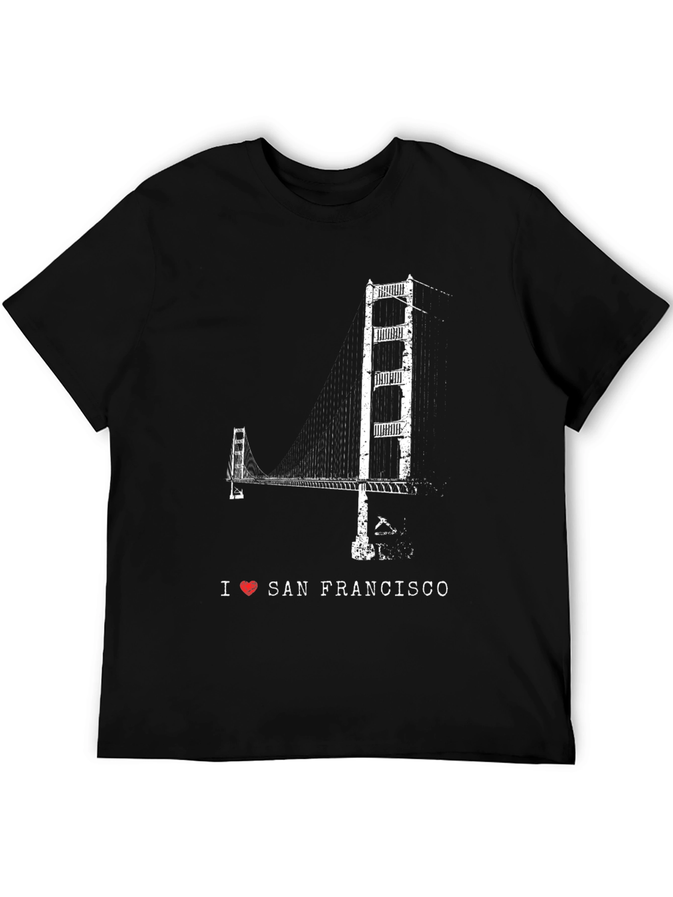 Show your love for San Francisco with this stylish black graphic tee. The shirt features a vintage-inspired graphic of the Golden Gate Bridge with the text "I ❤️ SAN FRANCISCO." The design is printed in white, creating a striking contrast against the black background. This comfortable tee is perfect for casual wear, sightseeing, or as a souvenir. Made from a soft, breathable fabric, it's ideal for everyday wear. A great way to express your fondness for the iconic city!