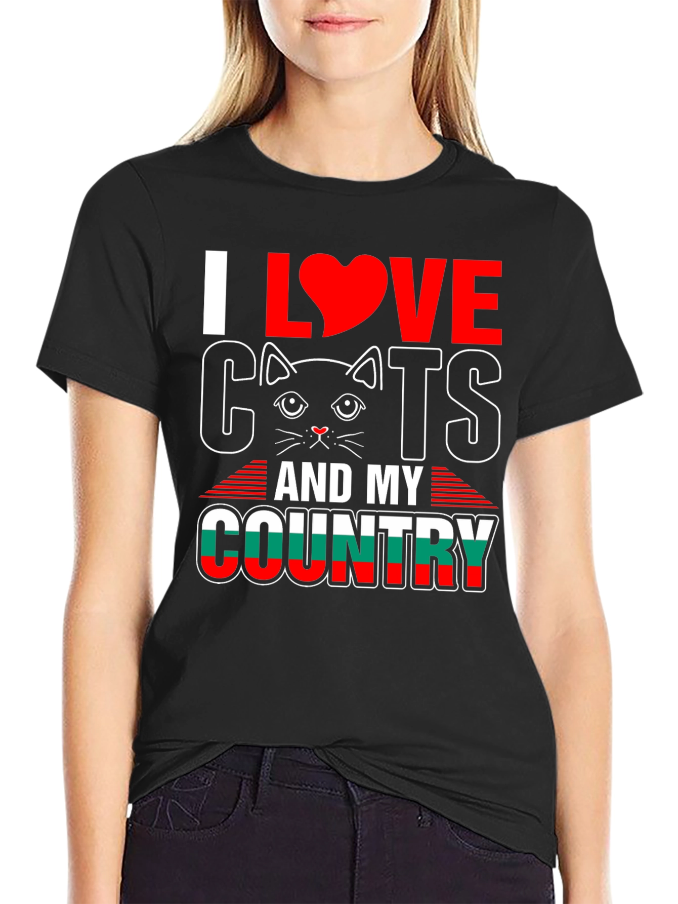 Show your love for cats and your country with this stylish black t-shirt. Featuring a playful design with "I LOVE" accompanied by a red heart, a cute cat face, and "AND MY COUNTRY” in bold letters. The design elements incorporate the colors of the Bulgarian flag (white, green, and red), making it a unique statement piece. Made from soft, comfortable fabric, this tee is perfect for casual wear, cat lovers, or anyone proud of their heritage. Ideal for everyday wear, cat events, or as a thoughtful gift.