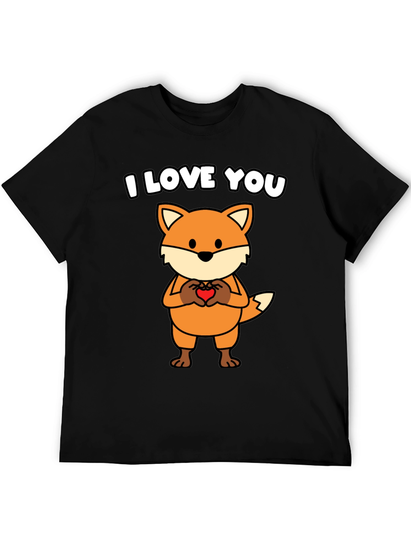 Express your affection with this adorable black t-shirt featuring a charming cartoon fox holding a heart. The playful "I LOVE YOU" print adds a touch of whimsy, making it a perfect gift or a fun addition to your casual wardrobe. The design is printed on what appears to be a comfortable and durable fabric. This tee is ideal for everyday wear, themed events, or simply to spread some love. Pair it with jeans, shorts, or a skirt for a stylish and heartwarming look. This unique graphic tee is sure to be a conversation starter and a cherished piece for any animal lover.