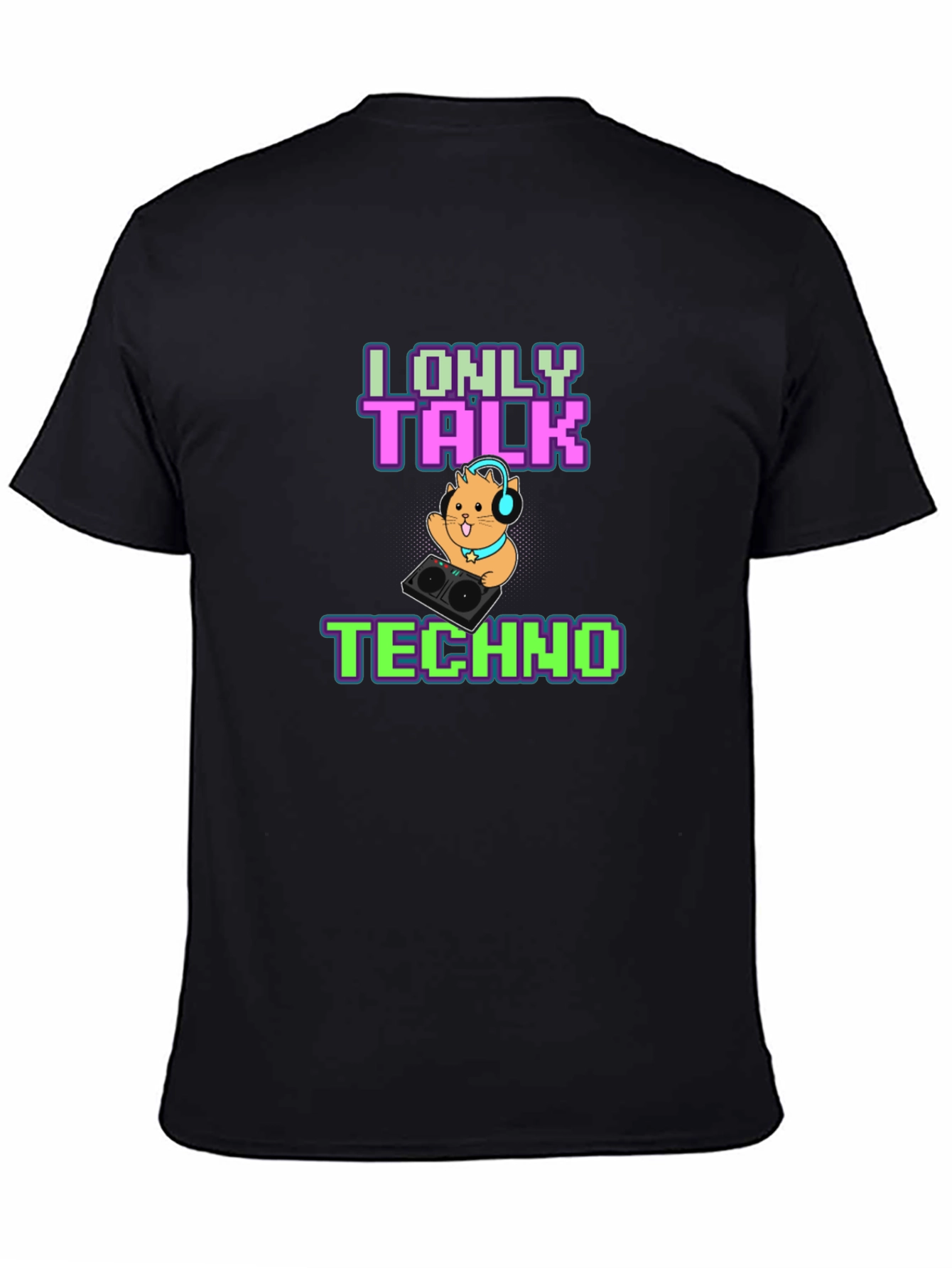 Get ready to rave with this unique black t-shirt featuring a cool design! It showcases pixelated text "I Only Talk Techno" above and below an adorable cartoon hamster wearing headphones and rocking a DJ setup. Perfect for techno music lovers and fans of quirky graphic tees. Made from comfortable, breathable fabric, this shirt is ideal for everyday wear, music festivals, or casual outings. Stand out from the crowd and show off your love for techno with this eye-catching tee!