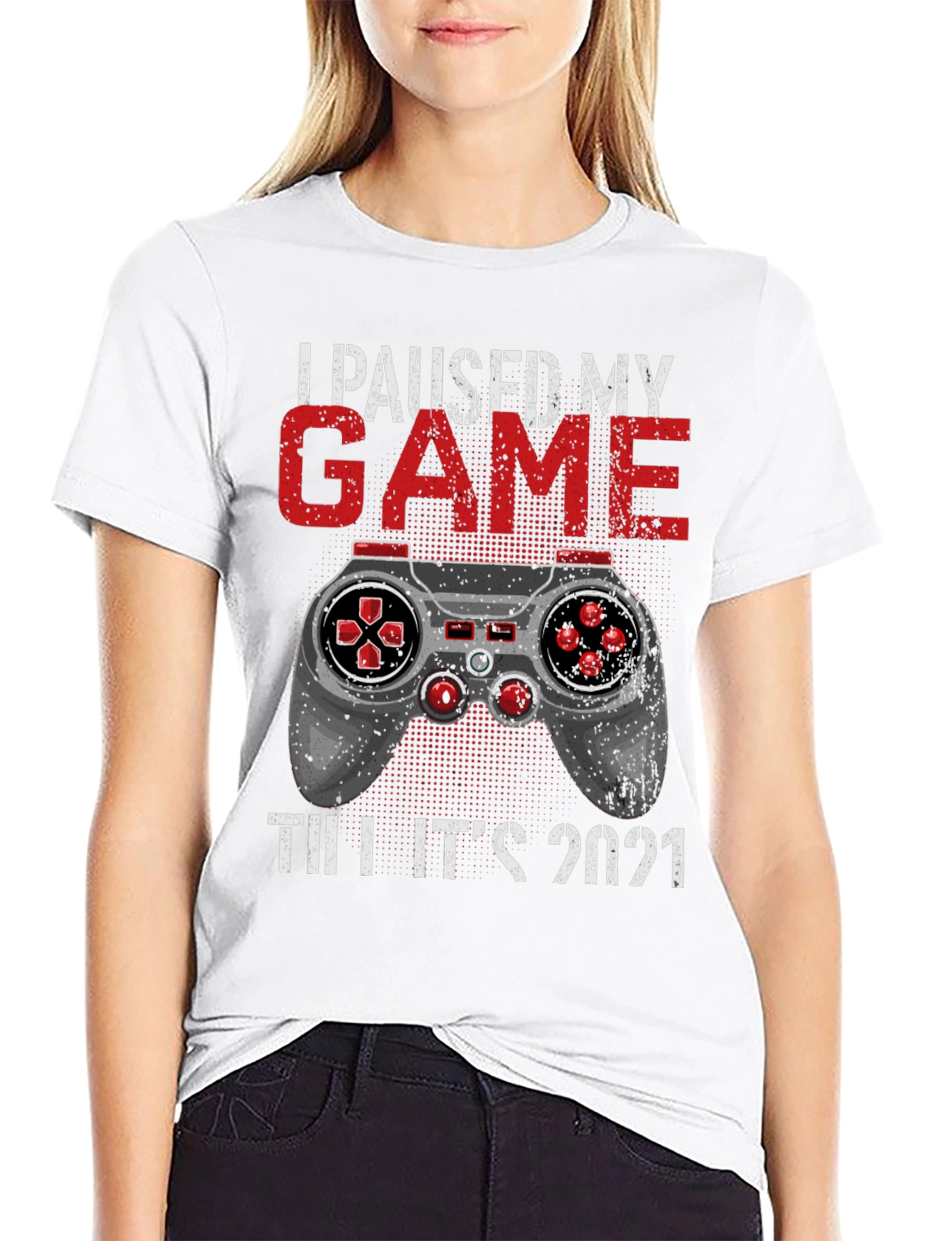 Show off your love for gaming with this playful and eye-catching black T-shirt! The design features the phrase "I Paused My Game Till It's 2021" in bold, distressed lettering. A detailed graphic of a classic video game controller adds a nostalgic touch. This shirt is perfect for gamers who love humor and comfortable clothing. It's ideal for casual wear, gaming sessions, or as a fun gift for the gamer in your life. Made from a soft-looking fabric, this T-shirt is sure to become a wardrobe favorite. Express your passion for gaming in style!