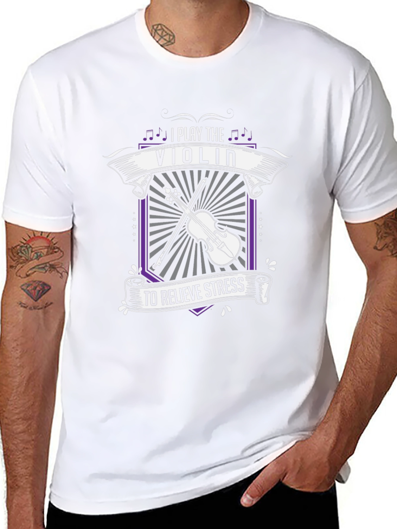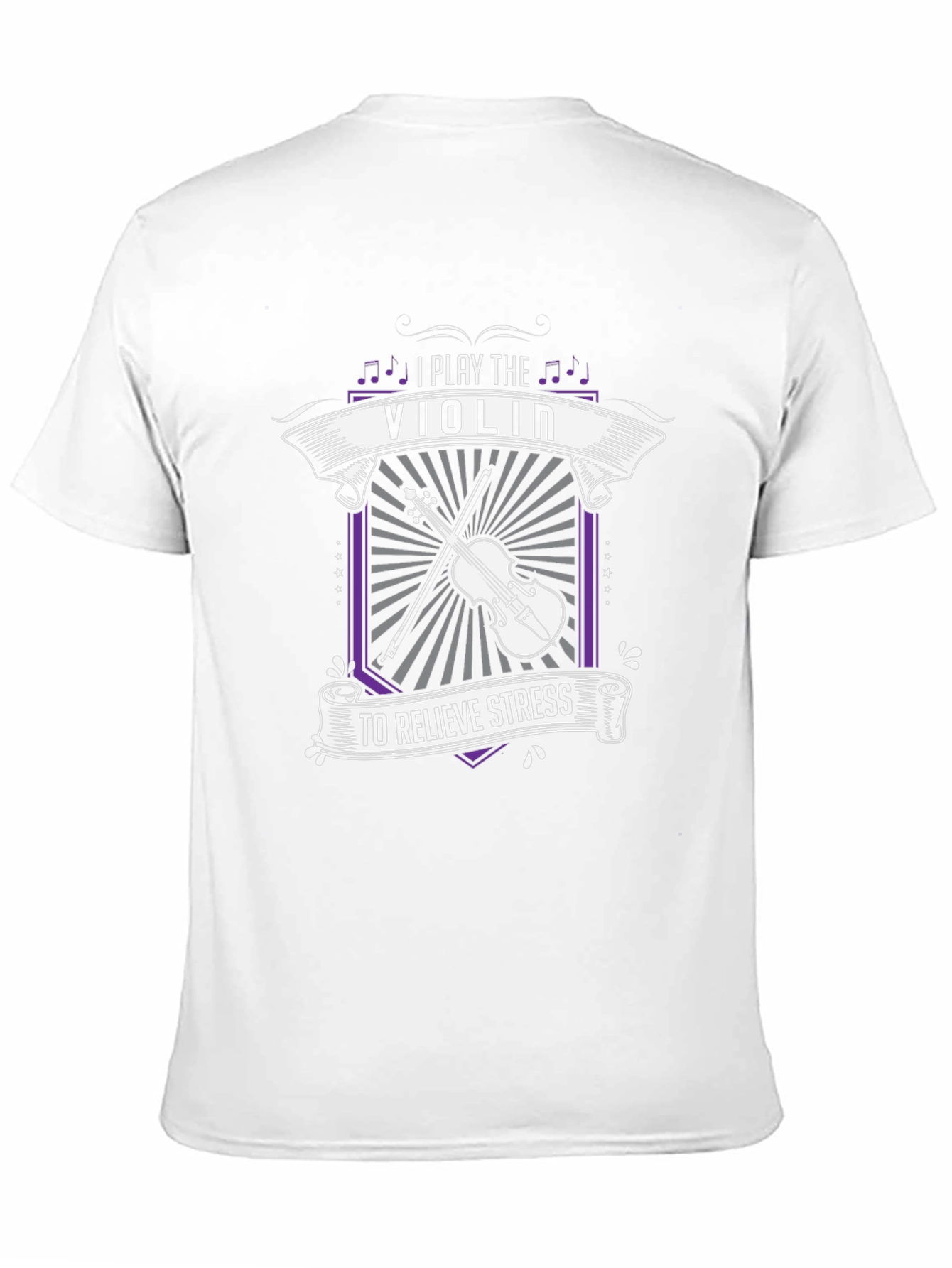 Show off your love for music with this stylish black t-shirt. The shirt features a unique design with the text 'I Play the Violin' above a detailed violin graphic, and 'To Relieve Stress' below, all framed within an ornamental shield. The design incorporates musical notes and is printed on a comfortable, casual fit tee. Perfect for violin players, music enthusiasts, or anyone looking for a fun and expressive garment. Wear it to practice, rehearsals, concerts, or just out and about to showcase your passion for the violin.