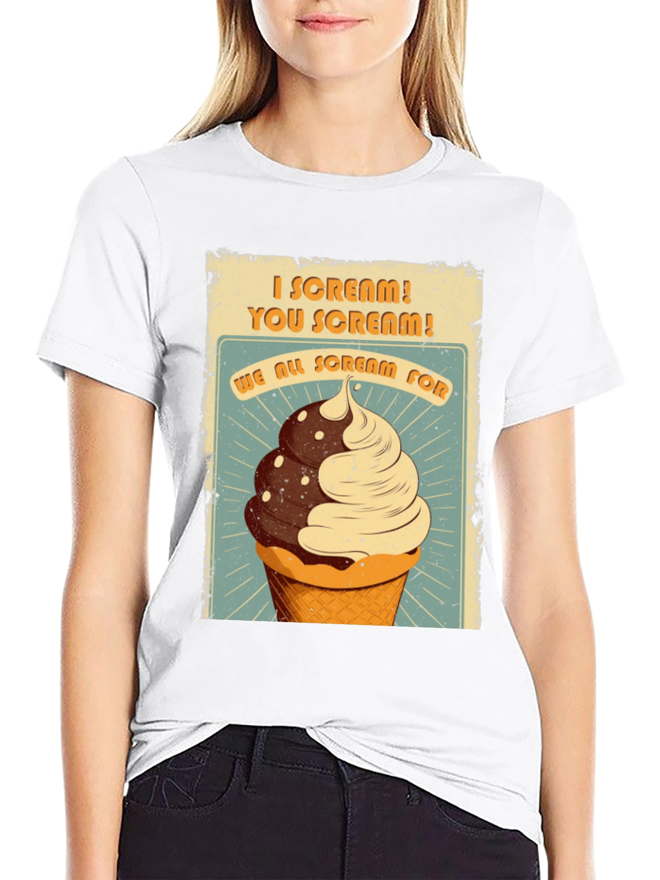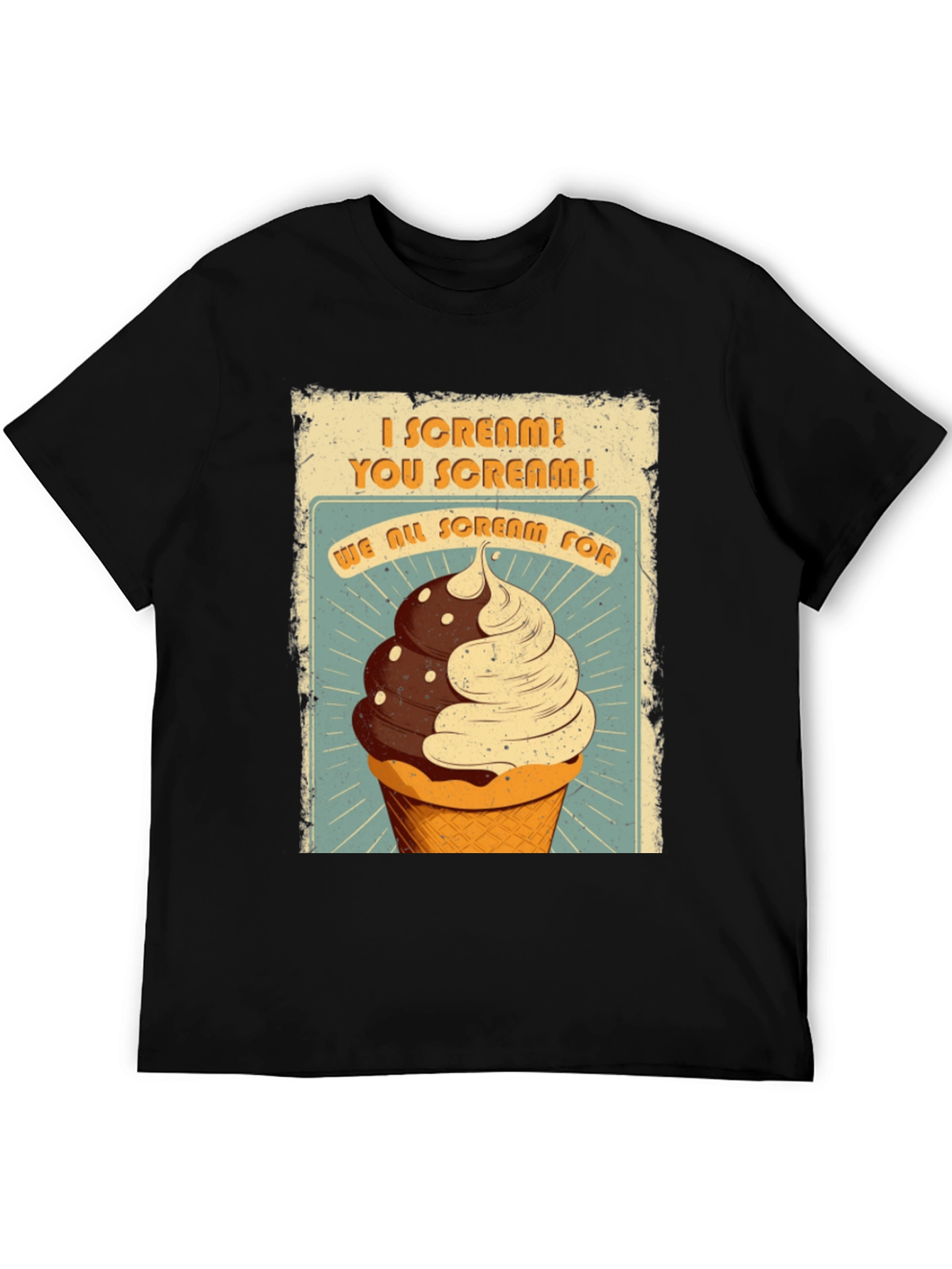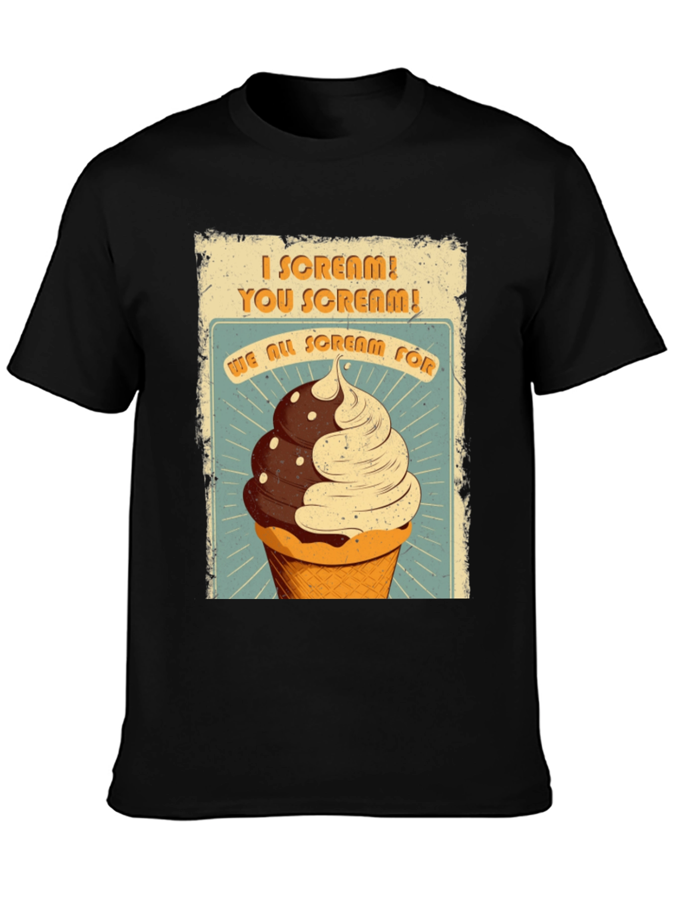 Indulge your sweet tooth with this fun graphic tee! This stylish black t-shirt features a retro-inspired design with a delicious-looking two-toned ice cream cone. The vintage-style print boasts the classic phrase "I Scream! You Scream! We all Scream for Ice Cream!" The soft, comfortable fabric makes it perfect for everyday wear. Show off your love for ice cream and stand out from the crowd. Ideal for casual outings, summer events, or just lounging around. A perfect gift for any ice cream enthusiast!