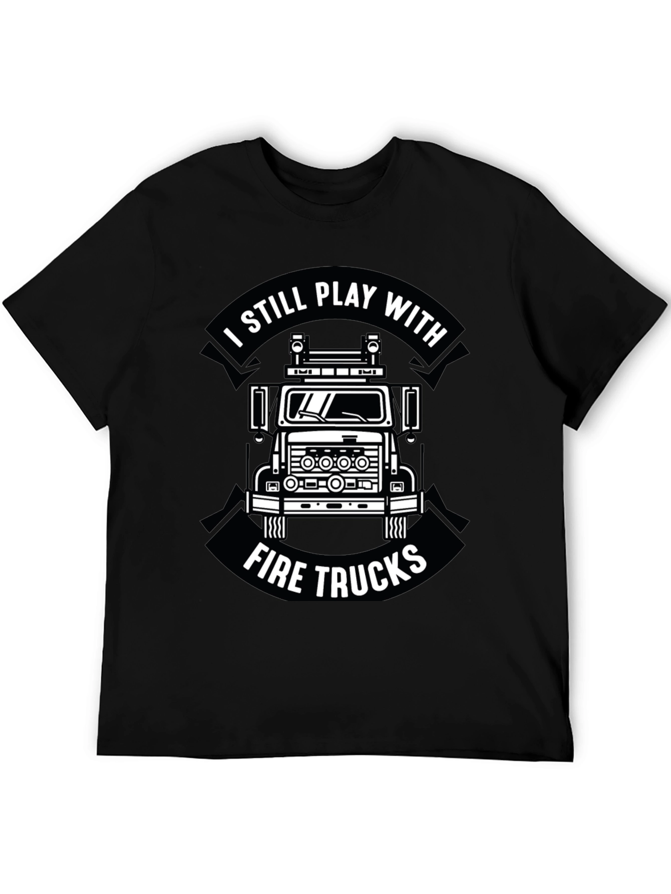 Show off your passion with this fun and unique 'I Still Play With Fire Trucks' T-shirt. This black, short-sleeve tee features a bold graphic of a vintage-style fire truck surrounded by text in a circular layout. Made from what appears to be a comfortable cotton blend, this shirt is perfect for casual wear. Ideal for firefighters, fire truck enthusiasts, or anyone with a playful sense of humor, this t-shirt makes a statement. Wear it to the station, a casual event, or as an everyday expression of your interests.