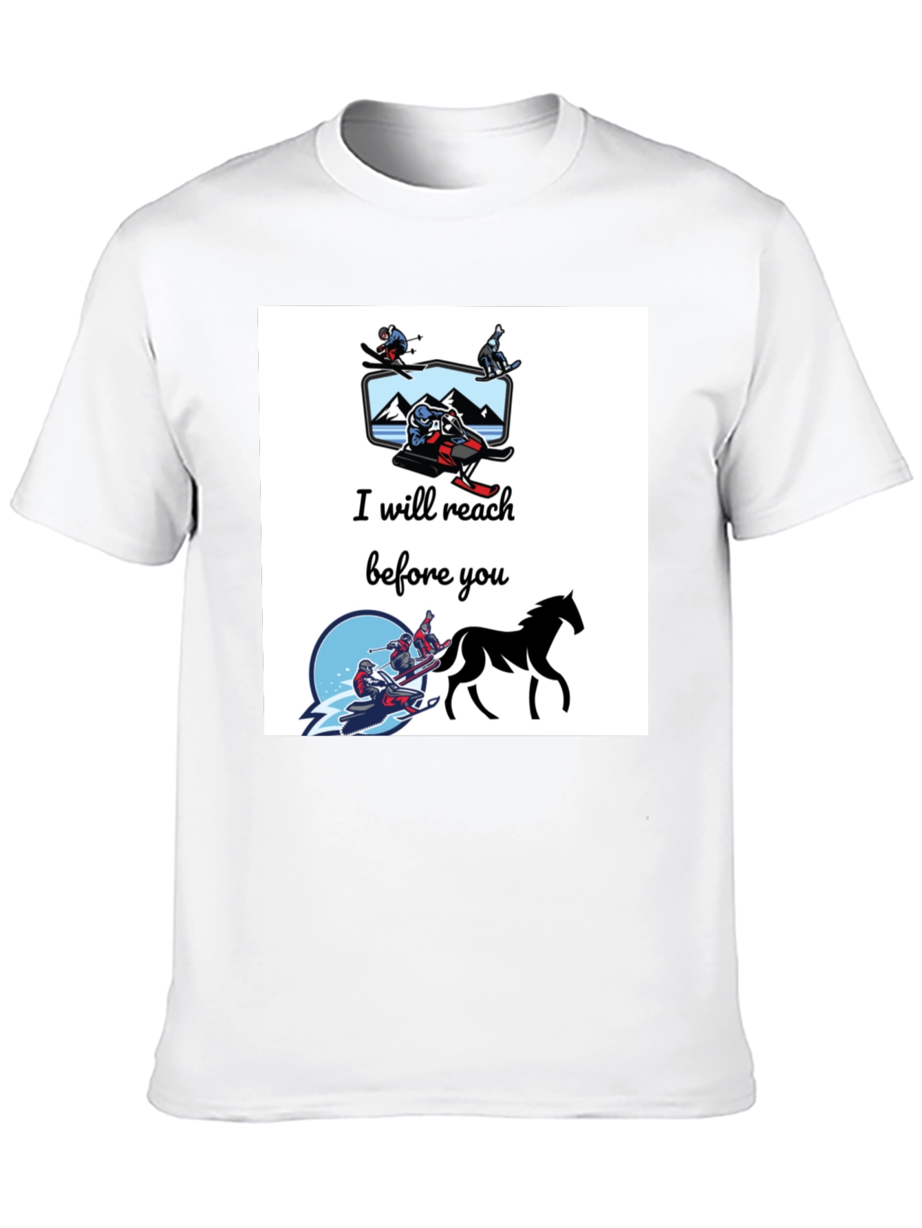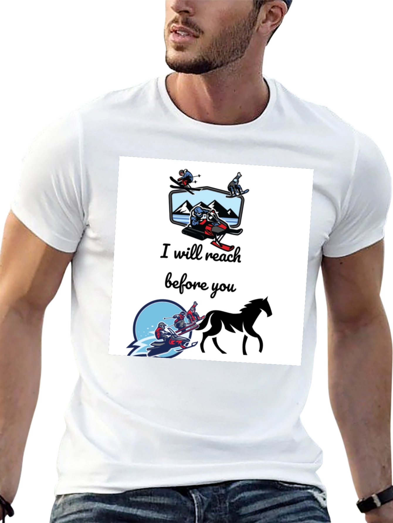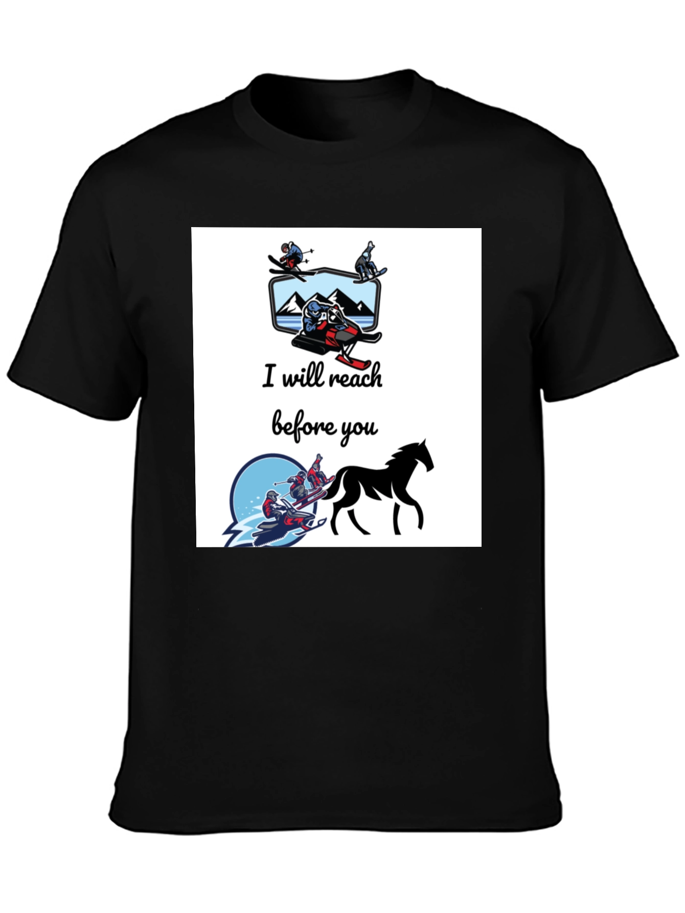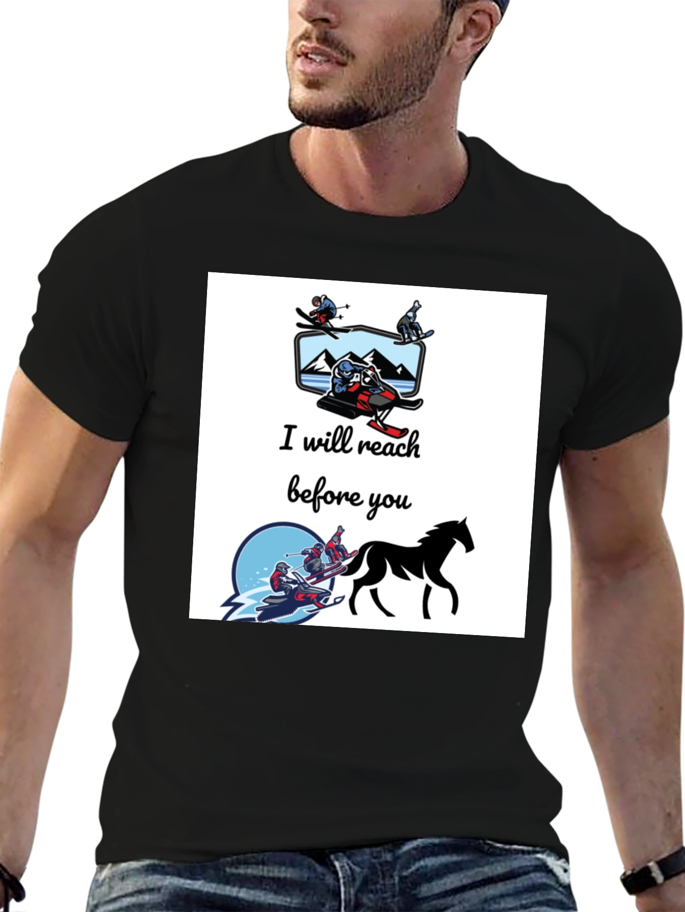 This sleek, black t-shirt features a unique and eye-catching graphic design. The print showcases a race between winter sports and a horse. It includes images of skiers, snowboarders, snowmobiles, and a horse, making it an ideal wear for winter sports enthusiasts. The phrase "I will reach before you" adds a competitive spirit. Made from comfortable materials, this t-shirt offers a relaxed fit for everyday wear. Perfect for casual outings, sports events, or as a standout piece in your wardrobe. A great gift idea for those who love winter sports and humor!