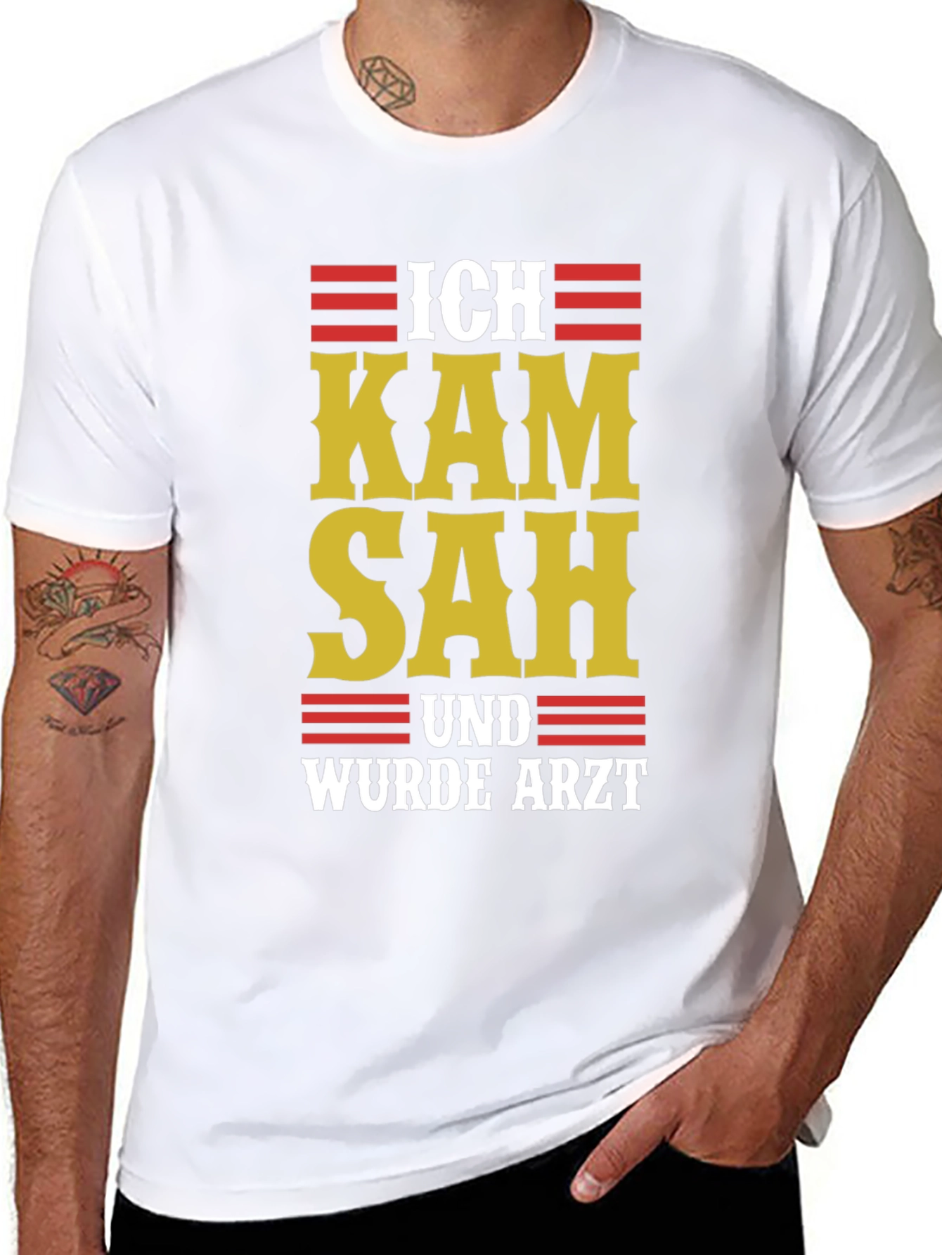 Show off your humor with this Ich Kam Sah Und Wurde Arzt T-Shirt. This black t-shirt features a bold, yellow and red graphic design with the phrase "ICH KAM SAH UND WURDE ARZT" across the center. The striking colors and eye-catching design make it a great conversation starter. This t-shirt is a comfortable and stylish way to express your fun-loving personality, perfect for casual outings or relaxed days. The classic fit is great for all body types. Makes a perfect gift for the medical doctor!