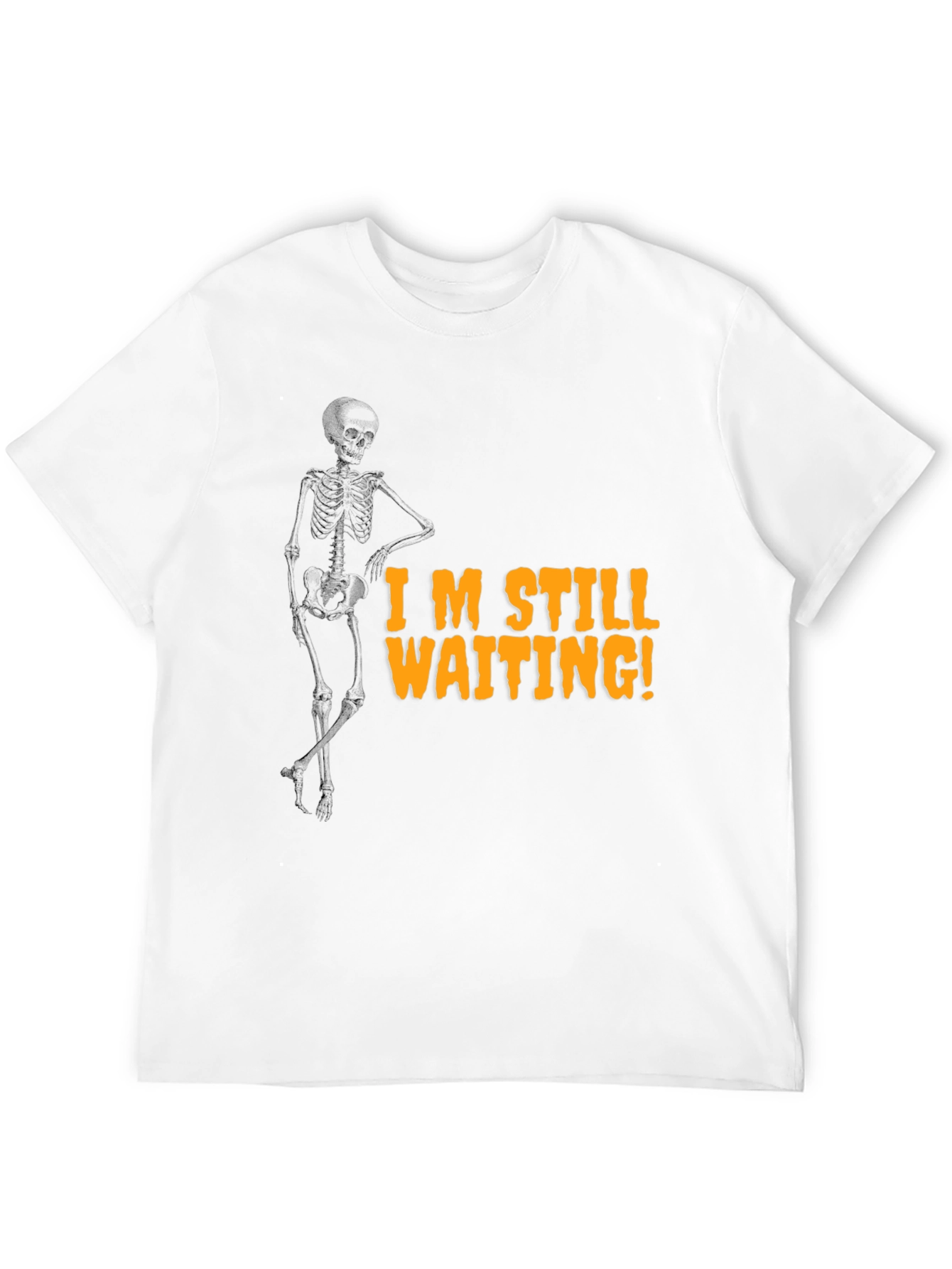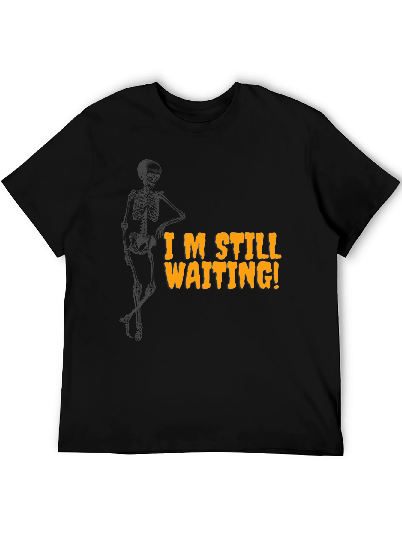 Express your humorous side with this unique black t-shirt. It features a graphic of a skeleton casually leaning, accompanied by the playful text "I'M STILL WAITING!" in a bold orange font. Made from a comfortable, likely cotton blend, this tee is perfect for casual wear, Halloween, or any occasion where you want to make a statement. The design is eye-catching and sure to spark conversations, making it a fun and expressive addition to your wardrobe. Show off your personality and patience with this quirky tee!