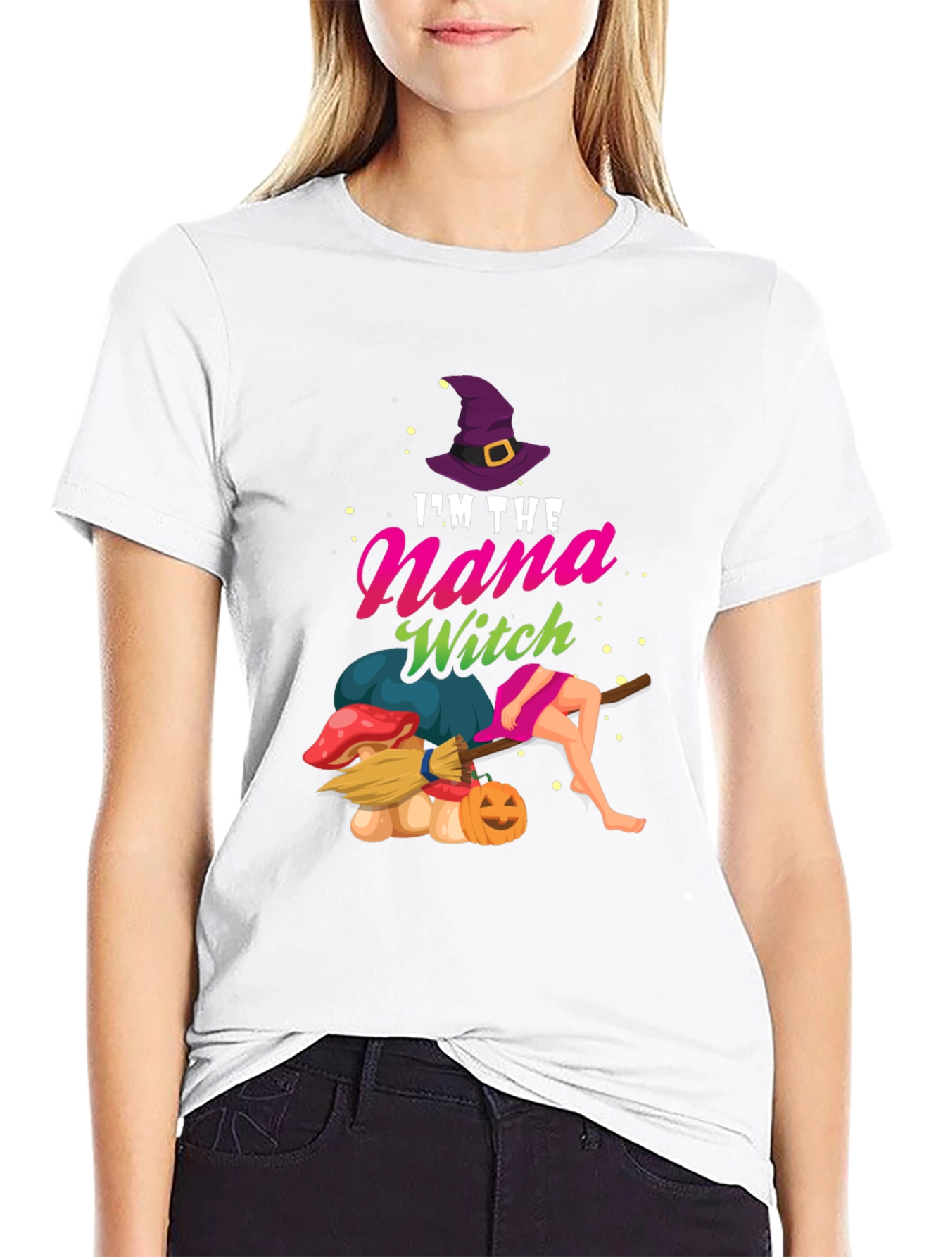 Embrace the spooky season with this fun and festive "I'm The Nana Witch" t-shirt! The design features a playful witch-themed graphic, complete with a witch's hat, charming cartoon, and Halloween accents. Made from what appears to be a soft, comfortable cotton blend, this black tee is perfect for casual wear during Halloween festivities, family gatherings, or simply showing off your Nana Witch pride. Its classic fit and durable construction ensure lasting comfort and style. Get ready to cast some stylish spells with this unique and eye-catching Halloween tee!