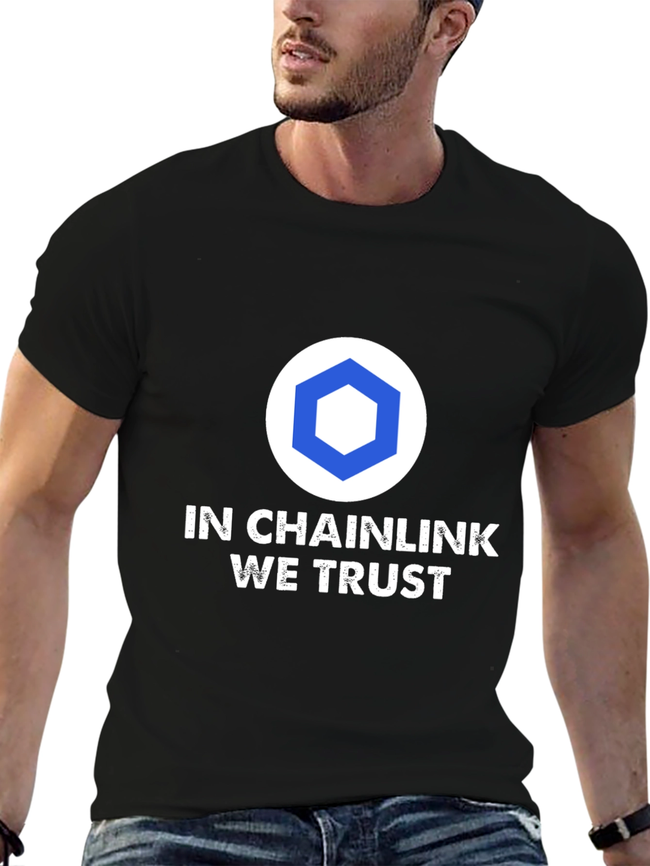 Show your support for Chainlink with this stylish black t-shirt. Featuring the iconic Chainlink logo encircled by a white border, above the bolded phrase "IN CHAINLINK WE TRUST". This shirt is sure to spark conversations and make a statement. Made from what appears to be comfortable cotton, this t-shirt is perfect for casual wear, crypto meetups, or showing off your investment choices. Get yours today and represent the future of decentralized oracles!