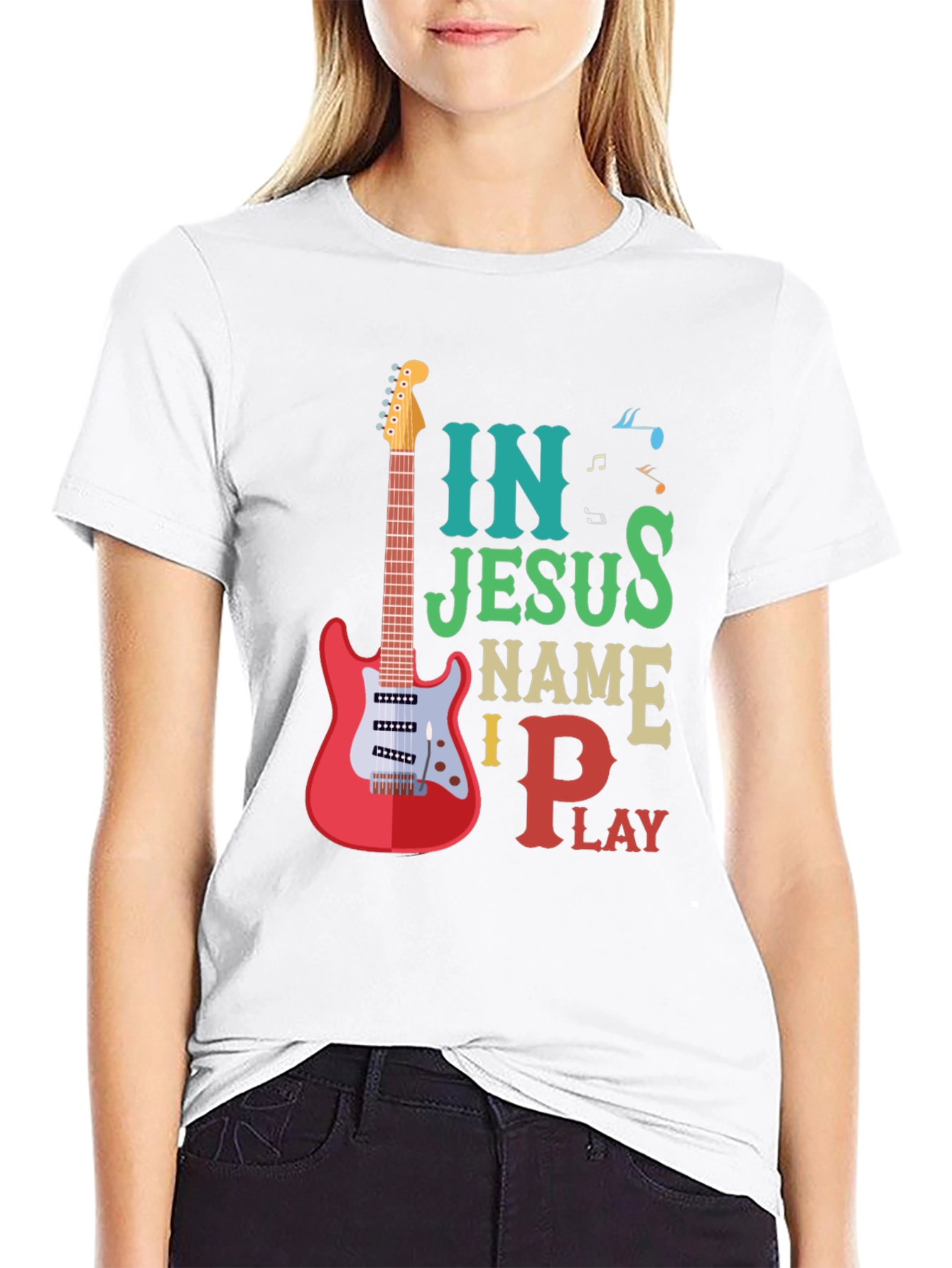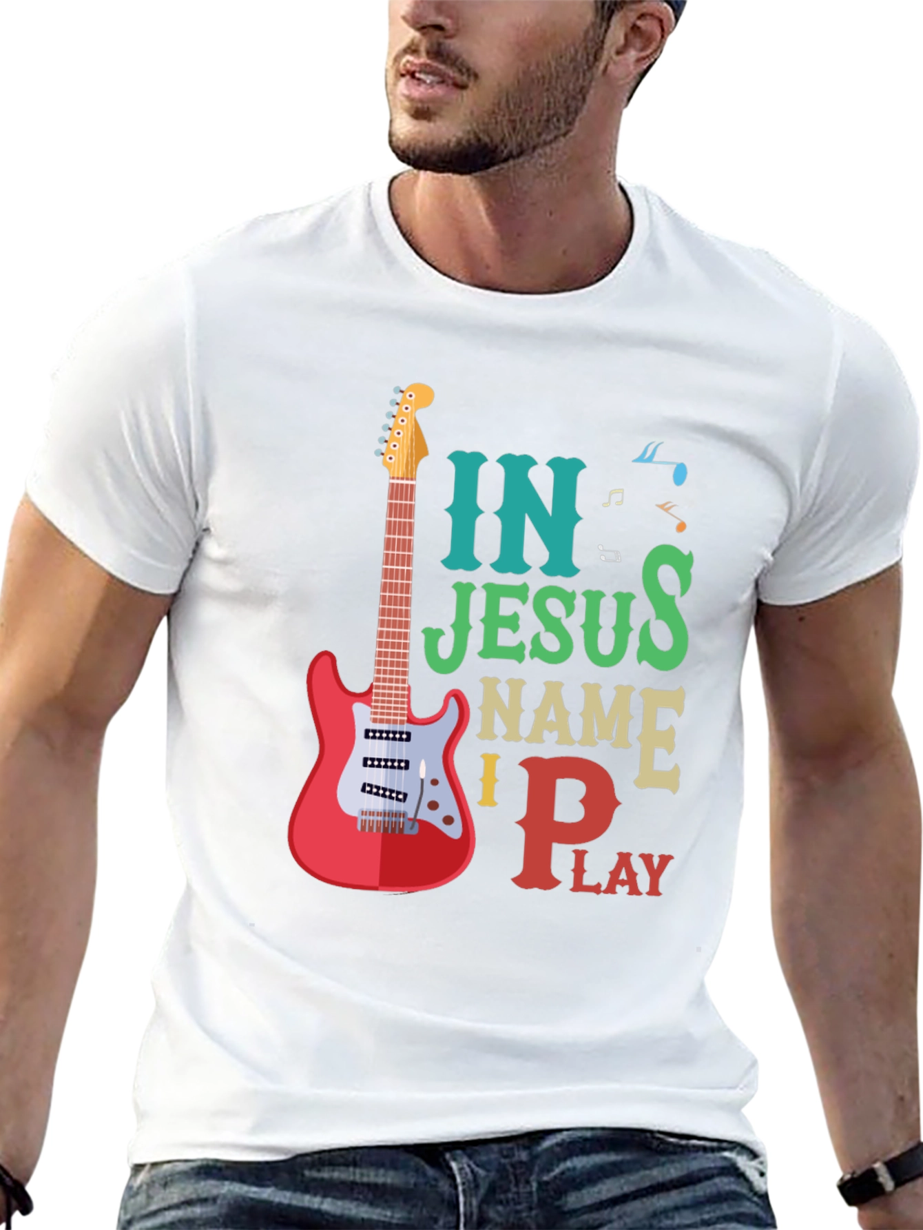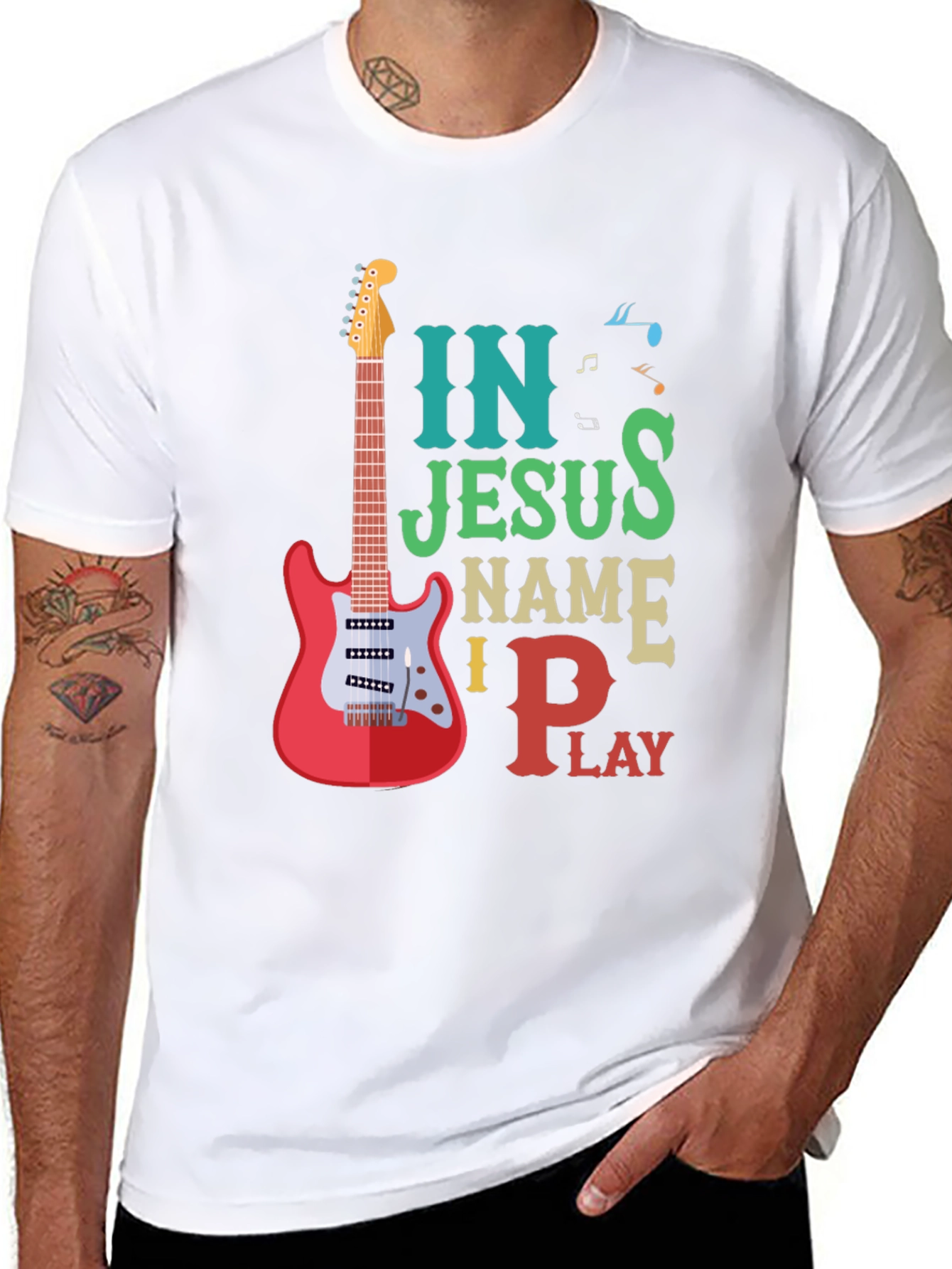 Show your love for music and faith with this unique t-shirt. Featuring a vibrant design with a guitar graphic alongside the words 'In Jesus Name I Play', this tee is perfect for Christian musicians and worship leaders. Made from a soft, comfortable material, it's ideal for casual wear, church events, or band practice. The colorful text and musical notes add a playful touch. Spread positivity and share your passion with this eye-catching shirt.
