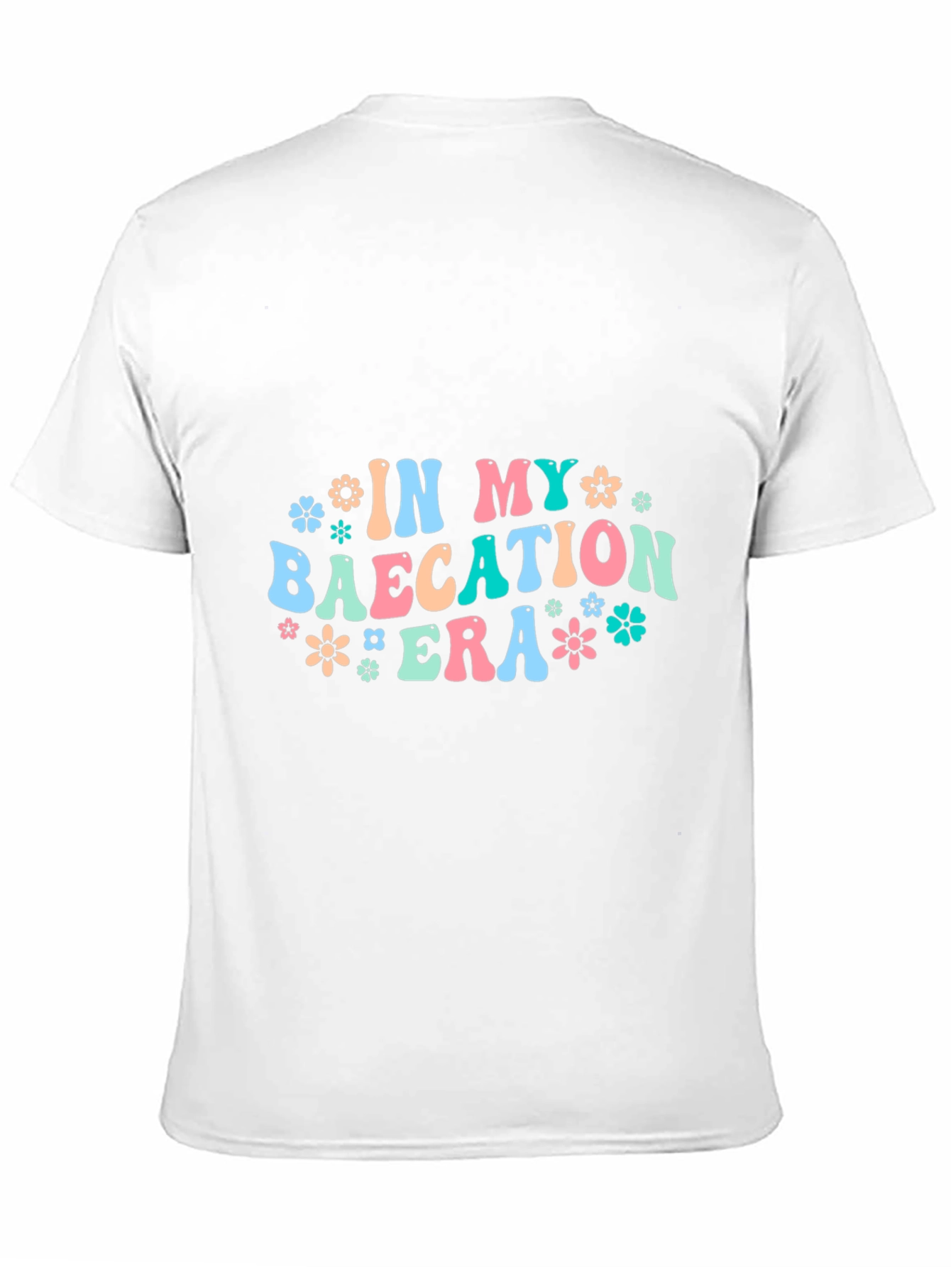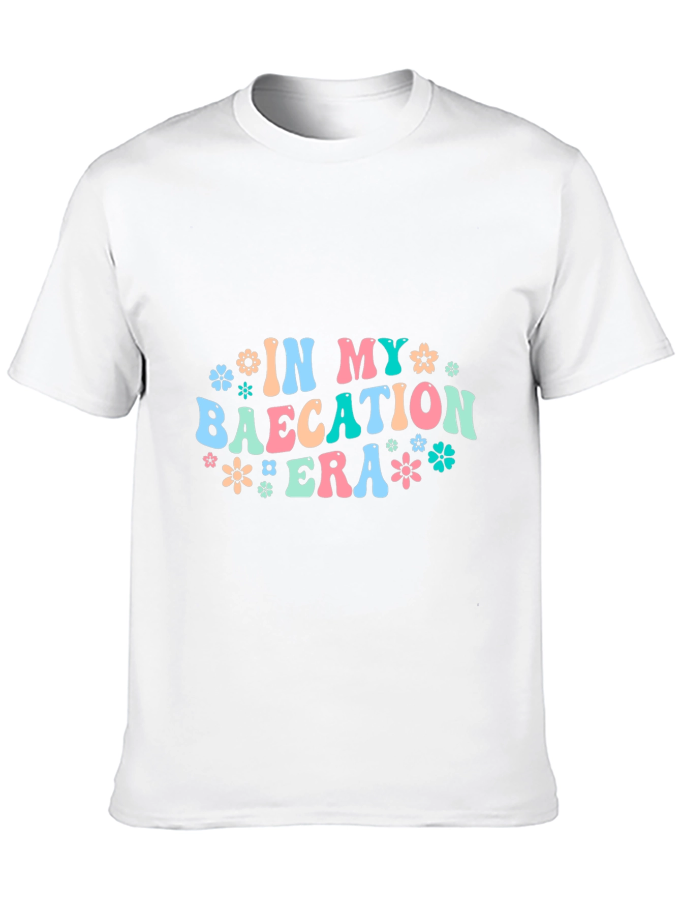 Embrace vacation vibes with this fun 'In My Baecation Era' graphic t-shirt. The vibrant retro text design features eye-catching colors like pink, blue, and orange, surrounded by playful floral accents. Made from comfortable, breathable cotton, this tee is perfect for sunny days and relaxed outings. Its classic crew neck and short sleeves offer a timeless fit. Wear it on your next getaway, beach trip, or casual hang with friends. This statement tee is sure to bring smiles and good times wherever you go, showcasing your fun-loving personality and vacation spirit.