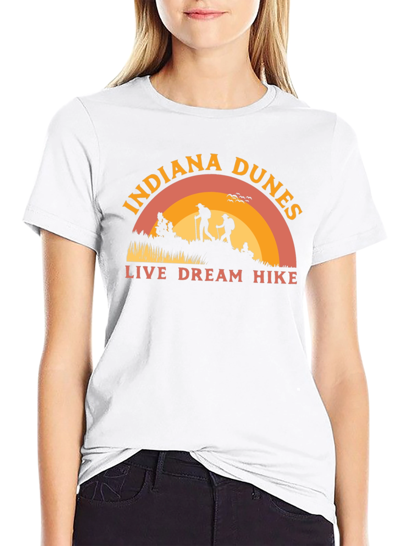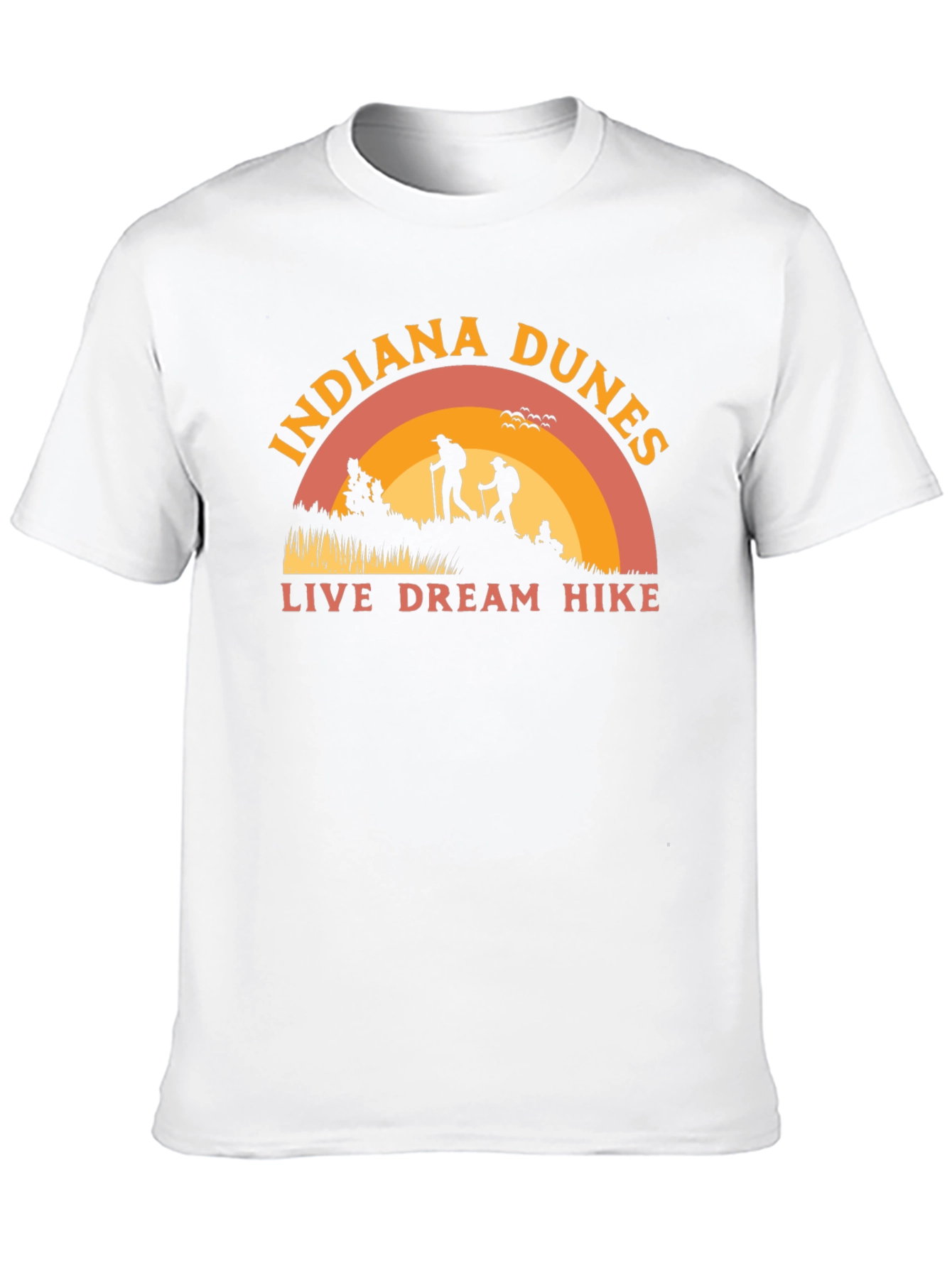 Showcase your love for nature with this stylish Indiana Dunes graphic tee. The black t-shirt features a vibrant sunset-inspired design with silhouetted hikers, trees, and birds flying above, creating a picturesque scene. "Indiana Dunes" is written in a curved fashion at the top with "Live Dream Hike" printed below. Made from comfortable fabric, this tee is perfect for casual wear, outdoor adventures, or as a souvenir of your time exploring Indiana Dunes. Whether you're hitting the trails or just dreaming of your next hike, this t-shirt is a great addition to your wardrobe.
