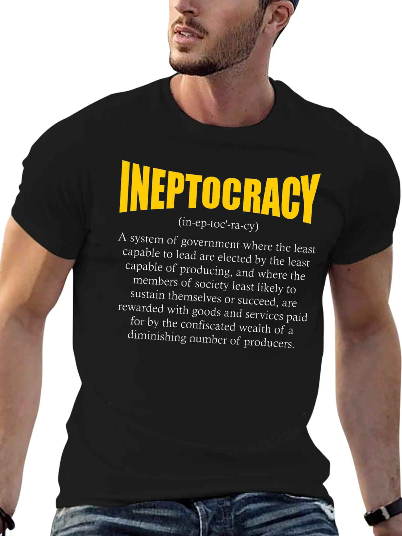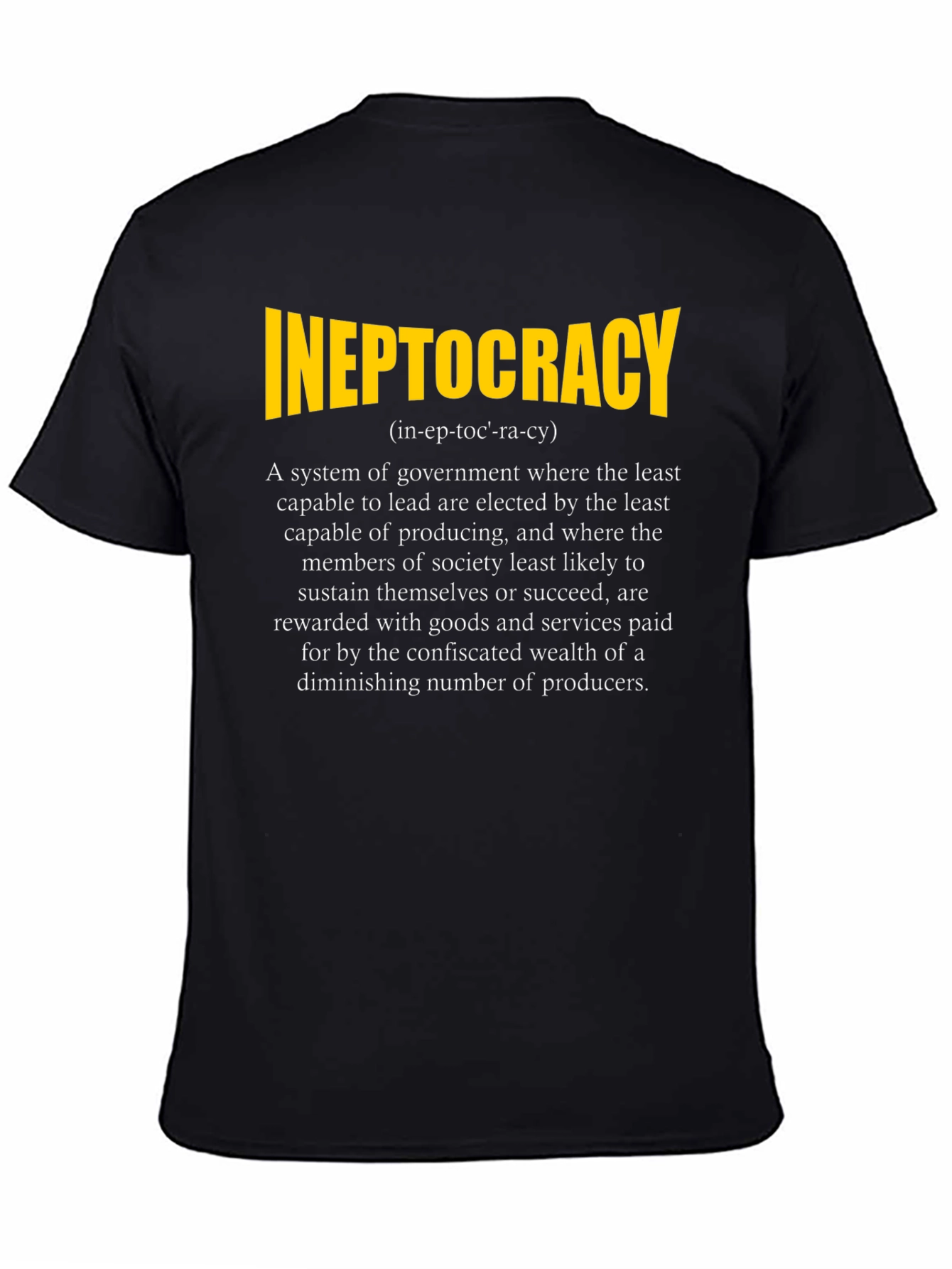 This black t-shirt features a bold and thought-provoking graphic. Emblazoned across the chest is the word "INEPTOCRACY" in bright yellow, accompanied by its phonetic spelling. Below, a detailed definition explains the concept of a government where the least capable lead and are supported by the confiscated wealth of a shrinking number of producers. Crafted from a soft-looking fabric, this shirt offers both comfort and a statement piece. Ideal for those who appreciate political satire, intellectual humor, or anyone looking to spark conversations. Wear it to rallies, social gatherings, or simply as an everyday expression of your unique perspective.