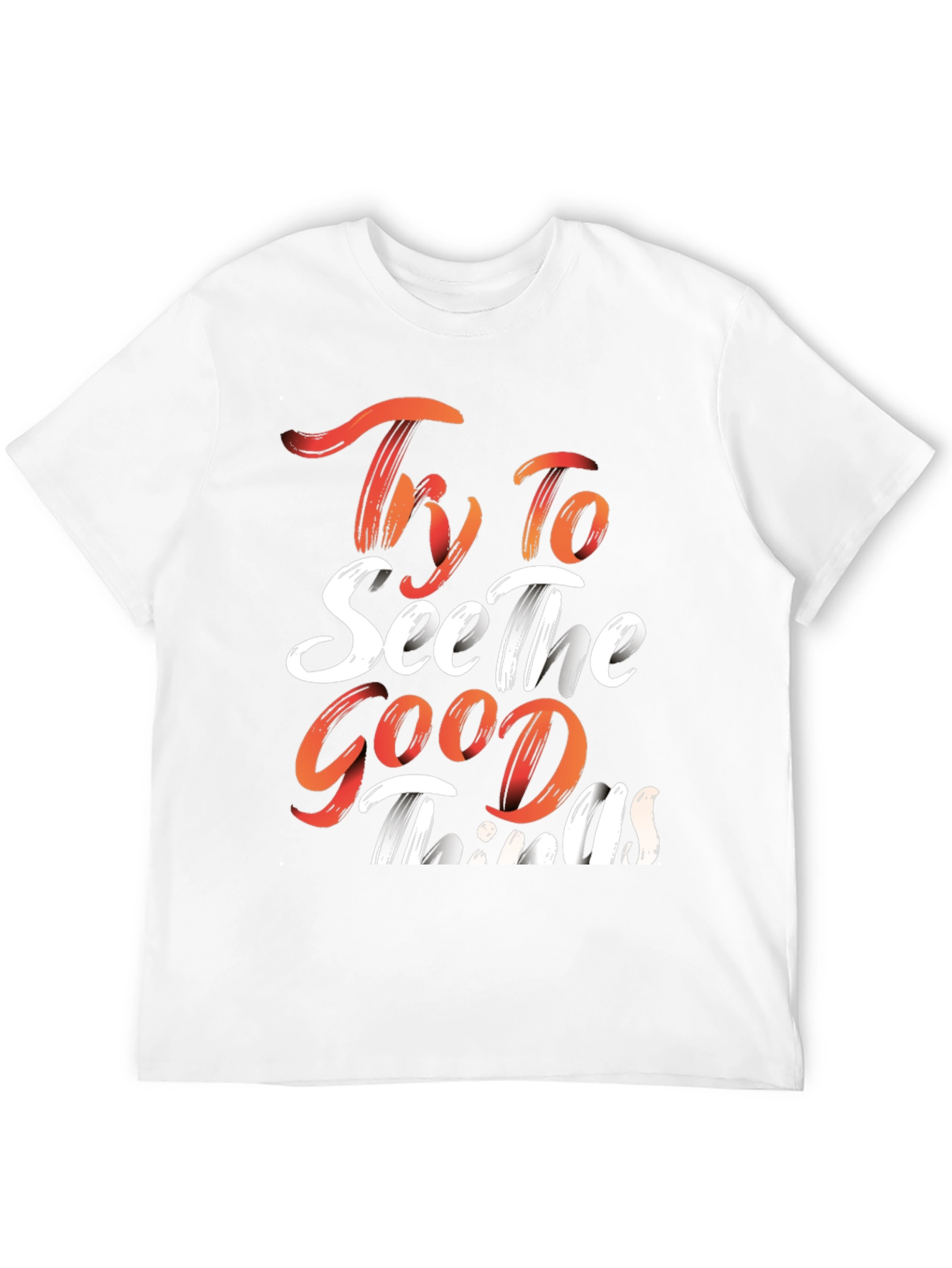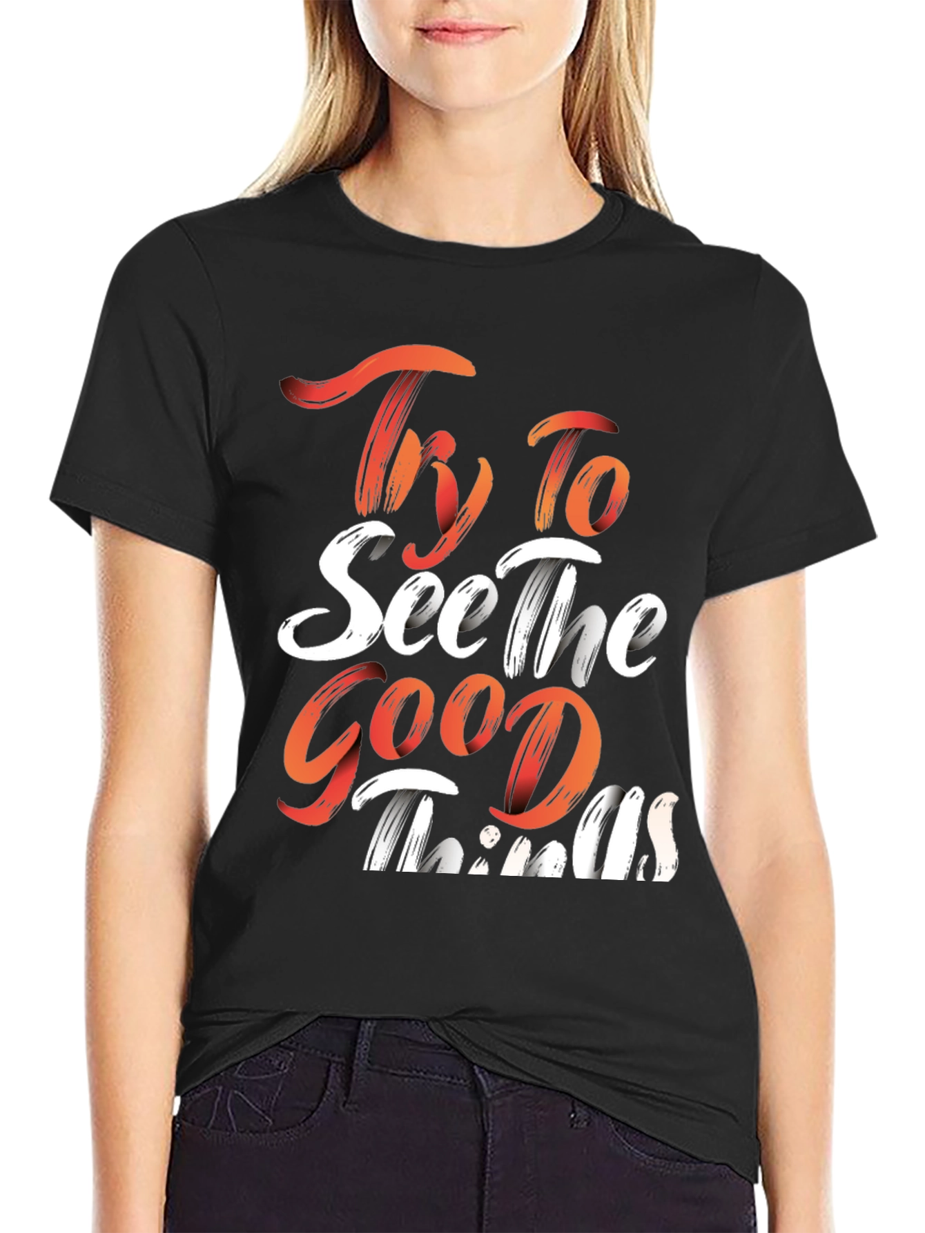 This black t-shirt features a bold, inspirational message. The words "Try To See The Good Things" are displayed in a vibrant combination of orange and white lettering, creating an eye-catching design. Made from a comfortable material, this tee is perfect for everyday wear. Show off your optimistic side and make a statement with this unique shirt. Whether you're heading to class, hanging out with friends, or simply relaxing at home, this t-shirt is sure to add a touch of positivity to your day. It's also a great gift idea for anyone who needs a little extra encouragement.