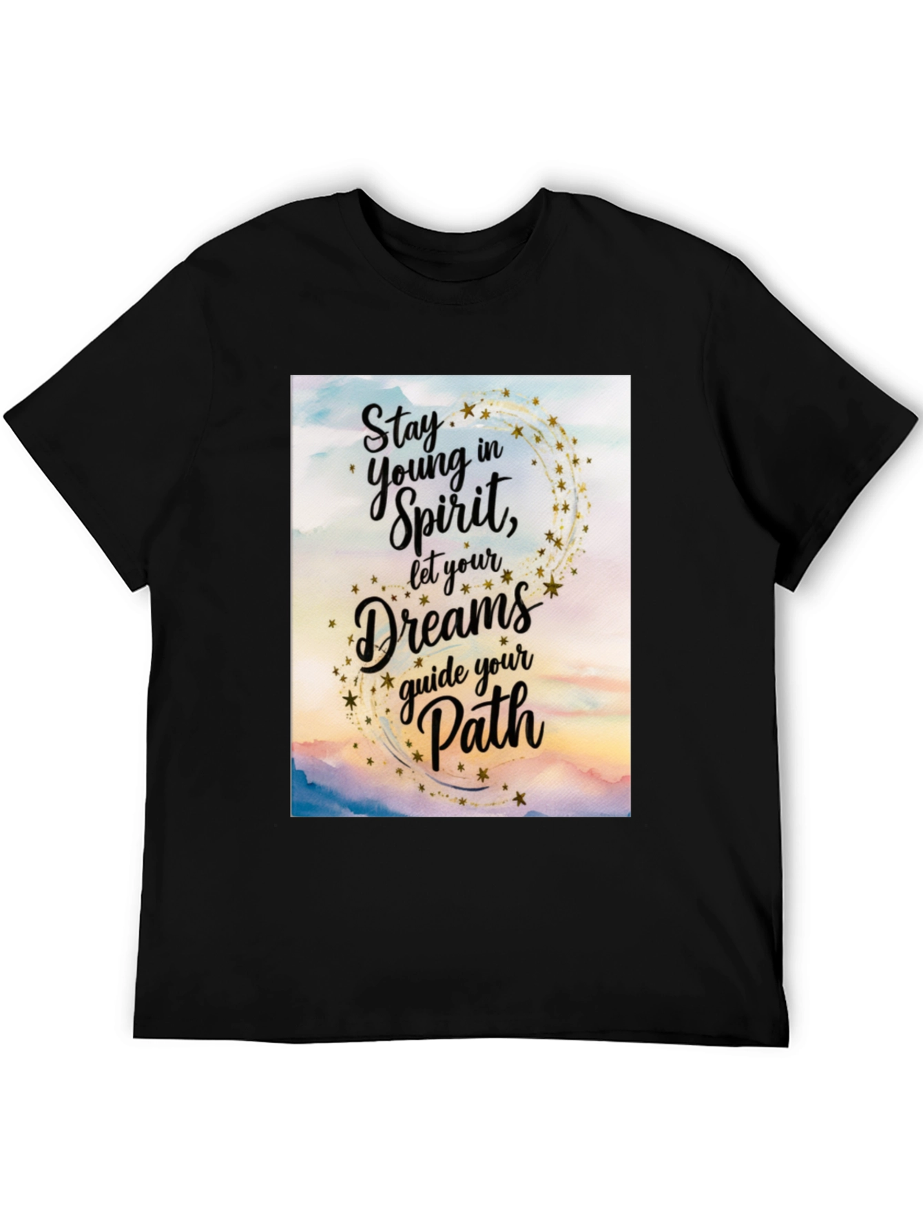 Embrace positivity with this inspiring graphic tee. This black t-shirt features a vibrant, uplifting design with the message 'Stay Young in Spirit, Let Your Dreams Guide Your Path,' surrounded by a dreamy, colorful background and sparkling star accents. Crafted from a comfortable, soft fabric, this tee offers a relaxed fit perfect for everyday wear. Whether you're seeking motivation or simply love eye-catching apparel, this shirt is a perfect choice to express your optimistic outlook. Wear it casually with jeans or dress it up with a blazer for a stylish, inspiring look.