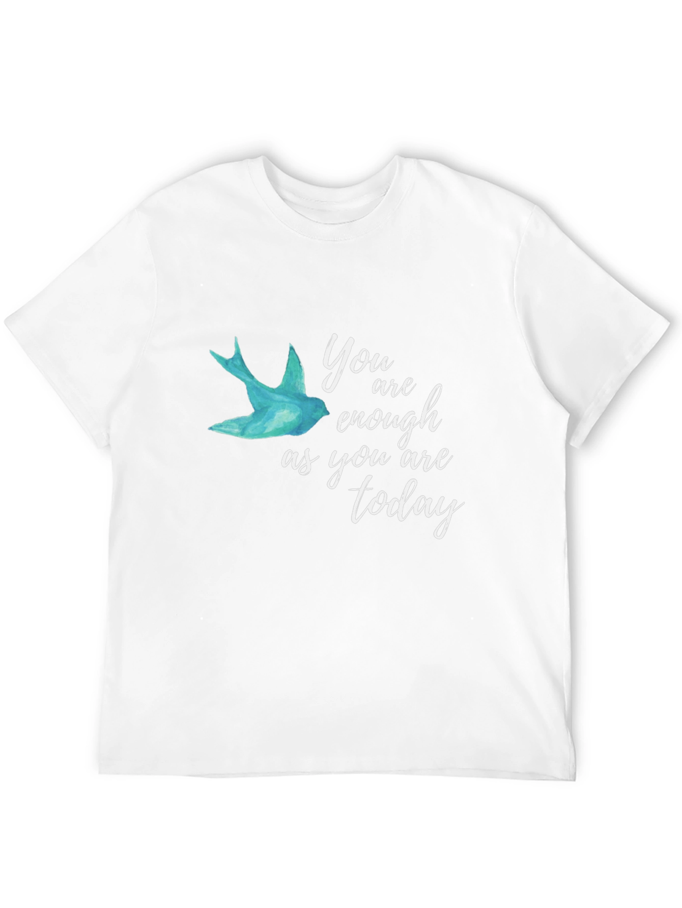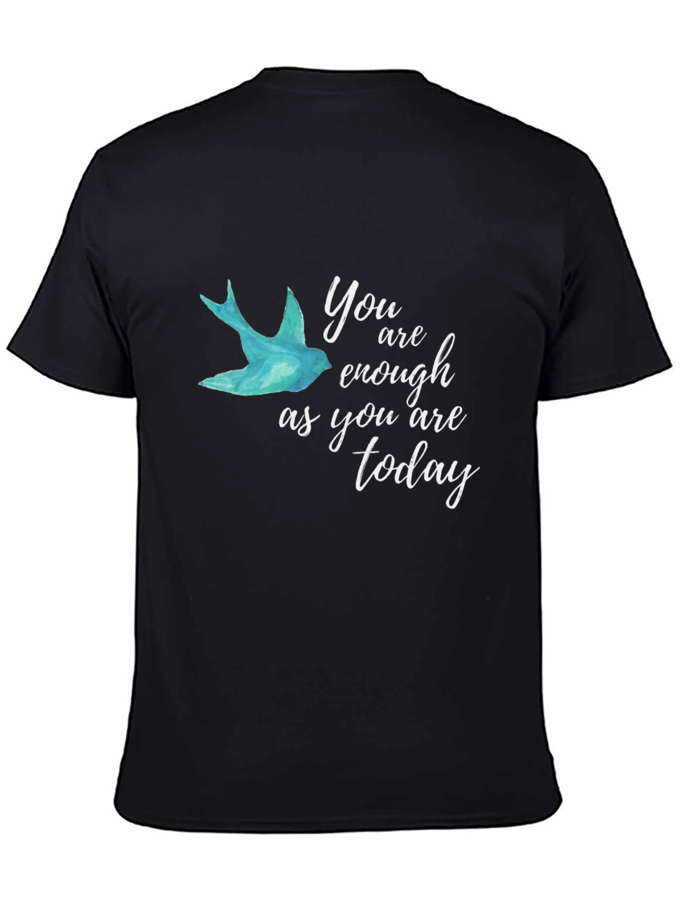 This black t-shirt features an uplifting message and artistic design. The phrase 'You are enough as you are today' is printed in an elegant white script, accompanied by a serene blue bird graphic. The soft fabric appears comfortable for everyday wear, making it perfect for casual outings, motivational events, or simply adding a touch of positivity to your wardrobe. Show your self-love and inspire others with this stylish and meaningful tee. It's an ideal conversation starter and a thoughtful gift for someone special, providing a daily reminder of their inherent worth. Perfect addition to a t-shirt collection.