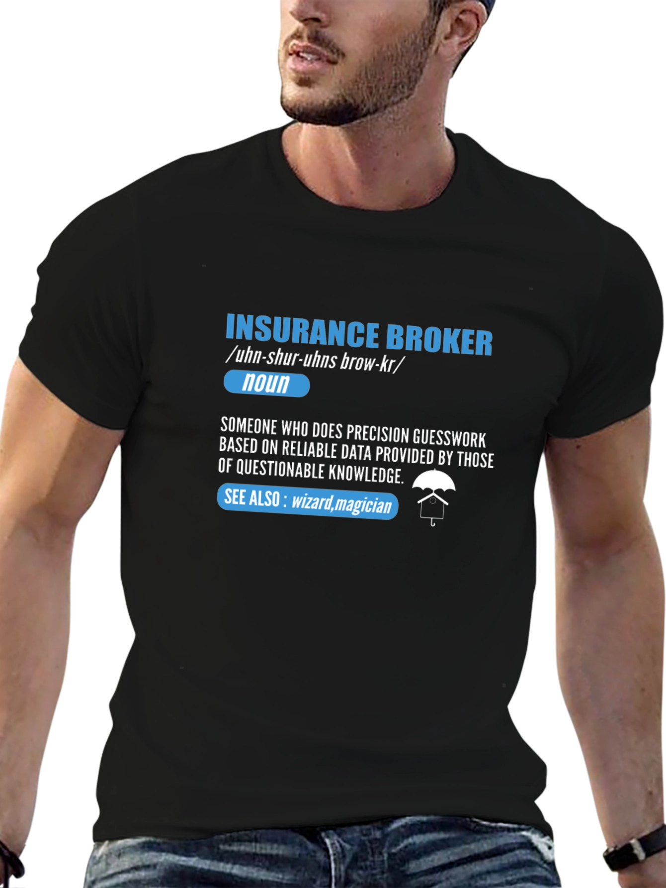 This black t-shirt features a humorous definition of an "Insurance Broker." The design includes the phrase "Insurance Broker" in bold blue letters, followed by a phonetic pronunciation and the word "noun." Below, a witty definition states, "Someone who does precision guesswork based on reliable data provided by those of questionable knowledge." The shirt also playfully suggests, "See also: wizard, magician," accompanied by a whimsical graphic. Made from what appears to be a soft, comfortable fabric, this tee is perfect for casual wear. It's an ideal gift for insurance professionals with a sense of humor or anyone who appreciates clever wordplay. Wear it to the office on casual Fridays, to industry events, or just around town to spark conversation.