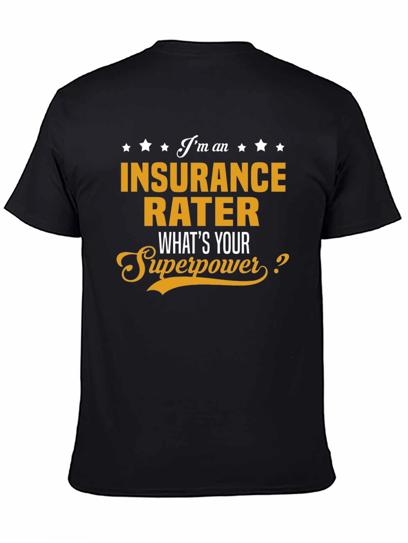 Show off your unique talent with this eye-catching black t-shirt. The shirt features bold, golden yellow text that proudly declares, "I'm an INSURANCE RATER. WHAT'S YOUR Superpower?" The playful message is highlighted by five white stars. Made from a soft-looking fabric, this tee promises comfort and durability for everyday wear. This shirt is perfect for insurance professionals with a sense of humor. Wear it to work, casual outings, or industry events to spark conversation and show pride in your profession. It also makes a thoughtful and fun gift for the insurance rater in your life.