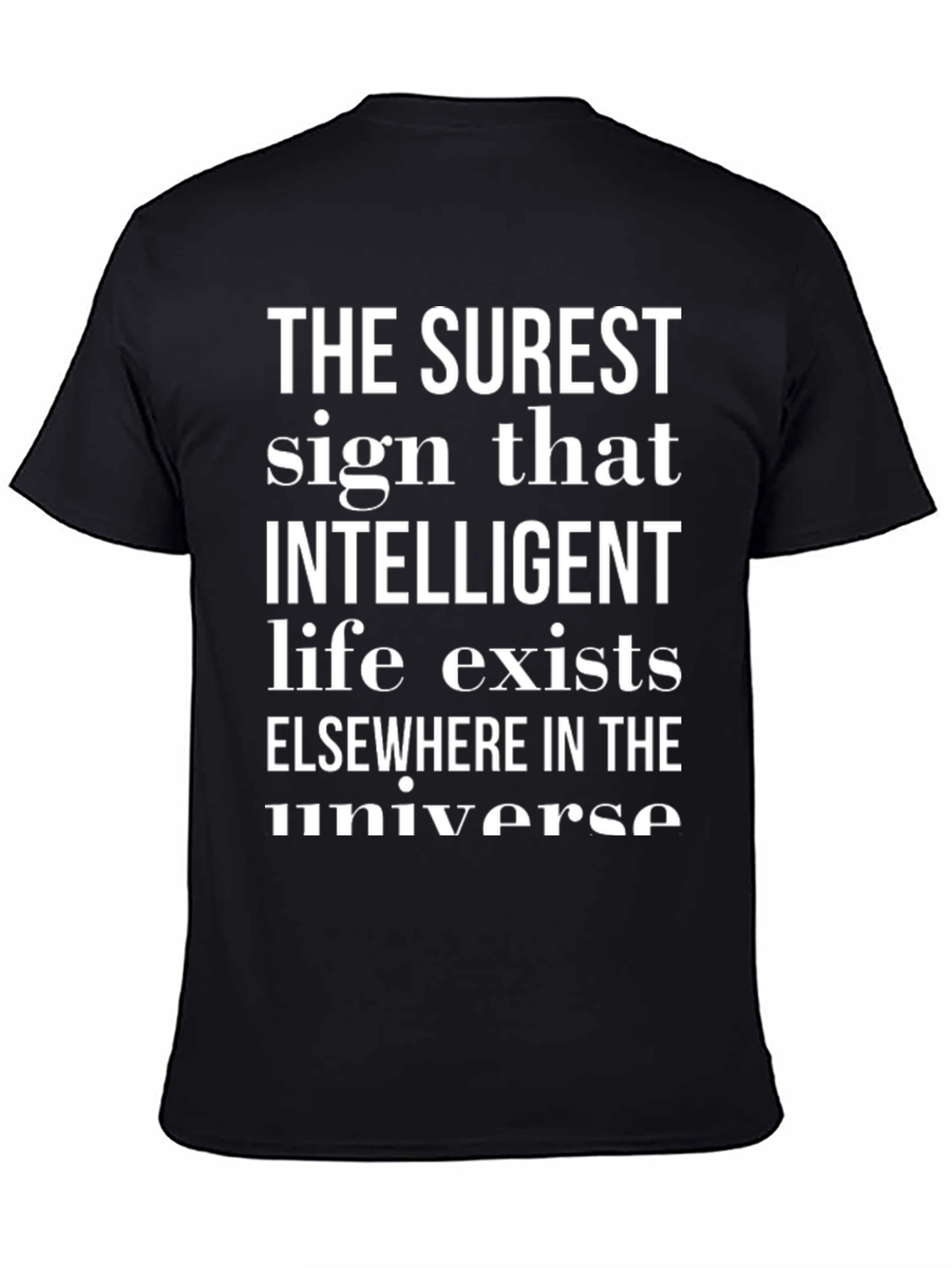 This eye-catching black t-shirt features a bold white text print that reads: "THE SUREST sign that INTELLIGENT life exists ELSEWHERE IN THE universe". Made from comfortable, breathable fabric, this statement tee is perfect for sparking conversations and expressing your unique perspective. The classic crew neck design ensures a relaxed fit, making it ideal for casual wear, social gatherings, or even as a thoughtful gift for the science enthusiast in your life. Stand out from the crowd and show your appreciation for the cosmos with this thought-provoking tee. Its unique design guarantees it will be a conversation starter wherever you go.
