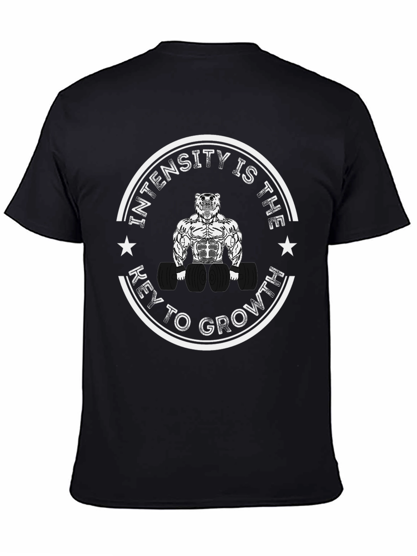 Show off your passion for fitness with this striking black t-shirt. The design features a bold circular graphic with the powerful message "Intensity is the Key to Growth" surrounding a stylized bear lifting weights. The graphic is printed in a clean white, providing a sharp contrast against the black shirt. This tee is perfect for workouts, casual wear, or making a statement at the gym. The classic fit and comfortable fabric make it ideal for everyday use. Whether you're a bodybuilder, powerlifter, or just love fitness, this shirt will help you express your dedication. Make it a part of your workout wardrobe today!