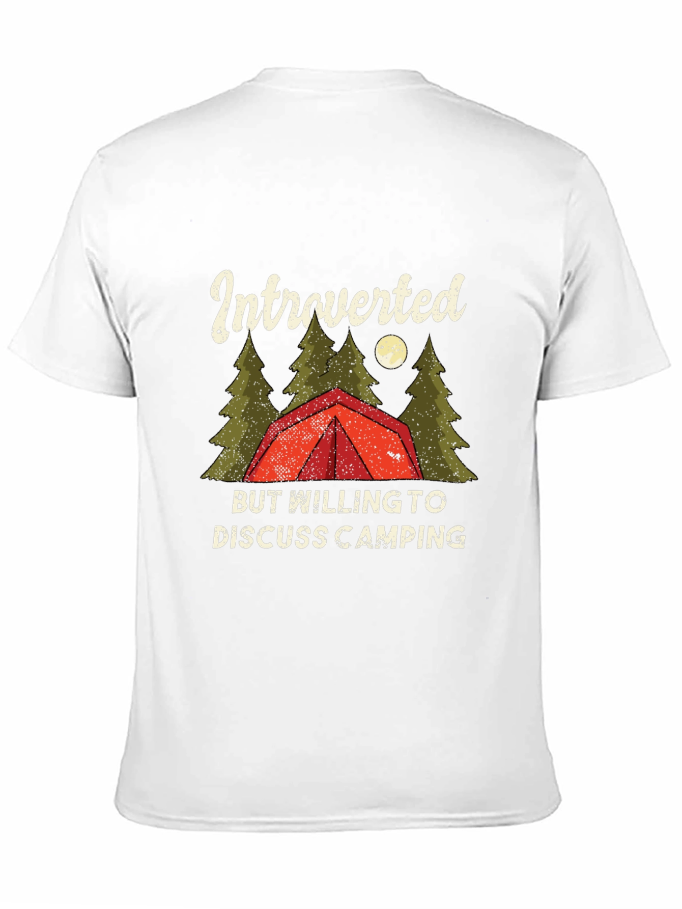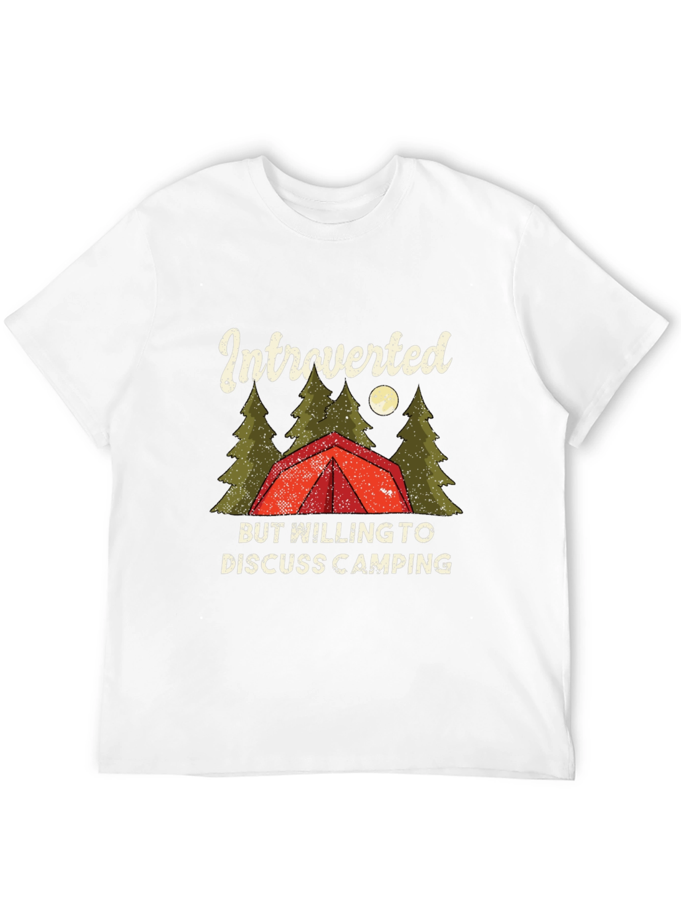 Show off your love for camping with this unique t-shirt! This black tee features the phrase "Introverted, but willing to discuss camping", alongside a graphic of a camping tent surrounded by trees and a moon. Made from comfortable materials, this shirt is perfect for wearing on your next outdoor adventure or while relaxing at home, dreaming of the wilderness. It's a great conversation starter for fellow camping enthusiasts. Whether you're hiking, pitching a tent, or sitting around a campfire, this t-shirt is sure to be a hit. Get yours today and let everyone know you're always up for talking camping!