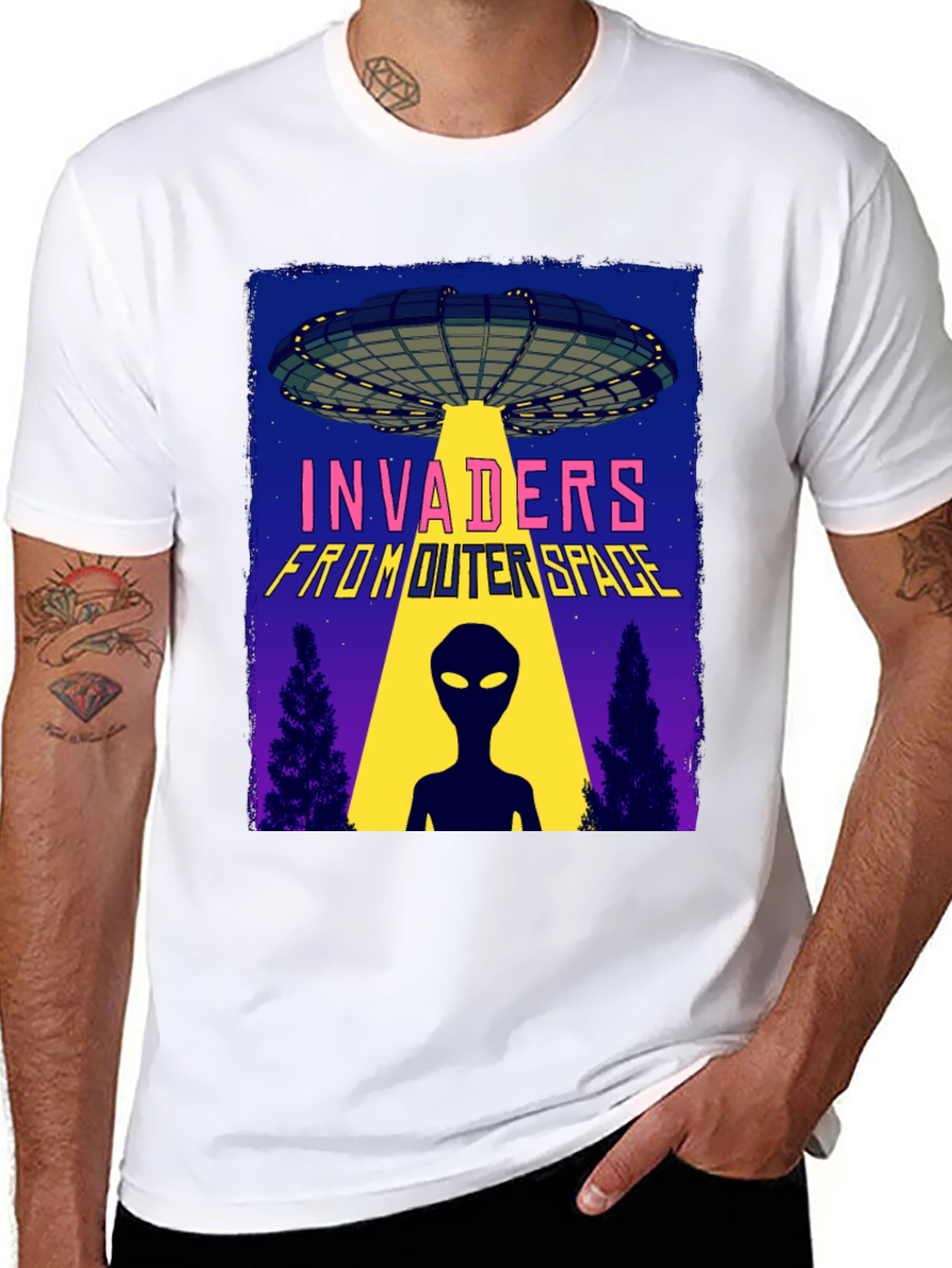 Embrace the unknown with this eye-catching graphic tee. Featuring a classic UFO hovering over an otherworldly silhouette, the design pops against the shirt's dark background. The 'Invaders From Outer Space' text gives it a retro sci-fi vibe. Made from a comfortable fabric, this tee is perfect for casual outings, sci-fi conventions, or lounging at home. Show off your unique style and start conversations with this bold and quirky statement piece. This t-shirt is bound to turn heads and spark curiosity.