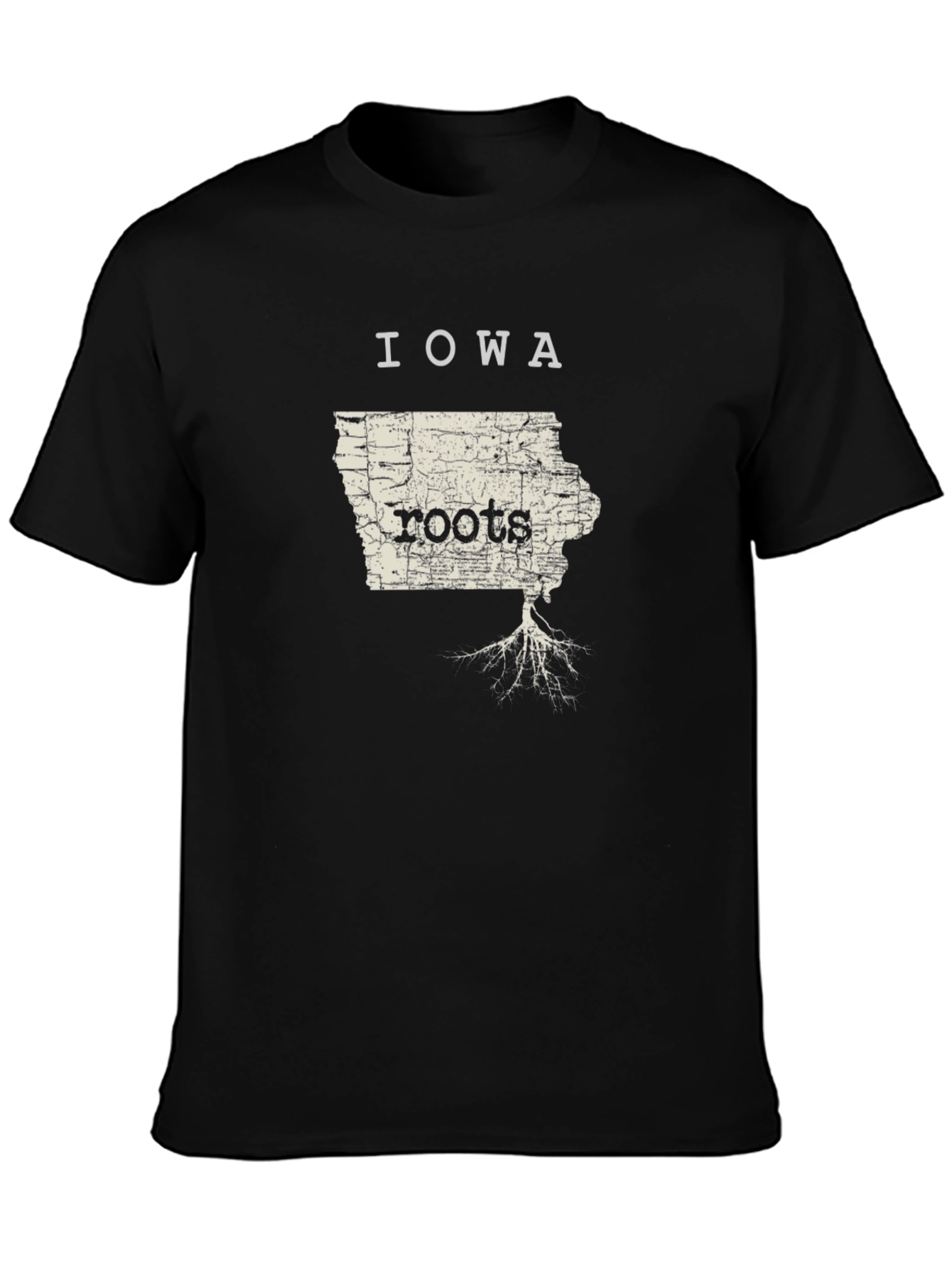 Show your Iowa pride with this stylish black graphic t-shirt. The shirt features a unique design with the word "IOWA" above the state outline. Inside the state is the word "roots," from which roots extend downwards. This soft and comfortable tee is perfect for everyday wear, showing off your state roots, casual outings, or as a thoughtful gift for fellow Iowans. Made from high-quality fabric, this shirt offers a comfortable fit and long-lasting durability. Whether you're a native Iowan or just love the Hawkeye State, this t-shirt is a must-have addition to your wardrobe.