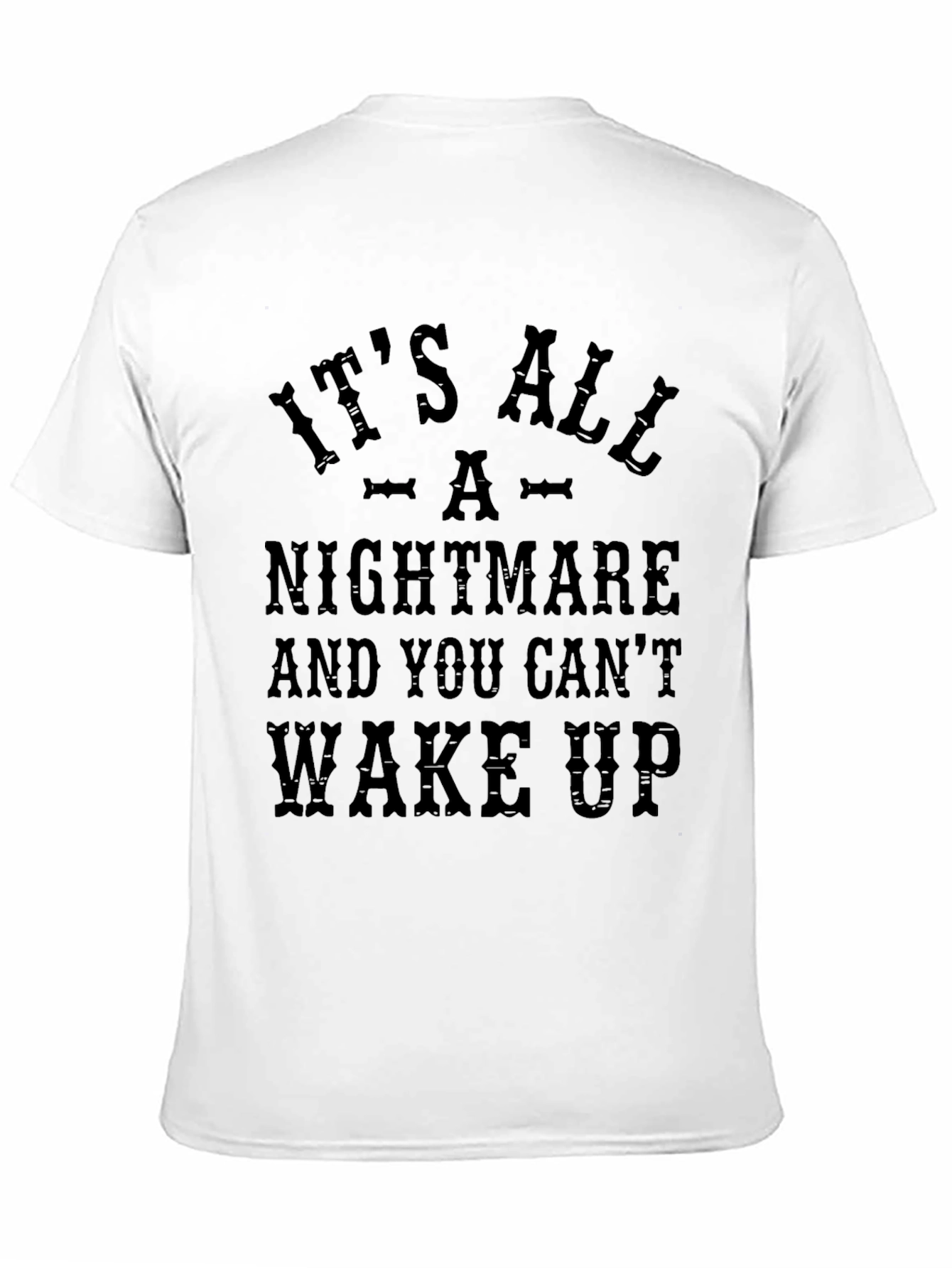 Embrace the edgy side with this black graphic t-shirt. Made from soft, breathable fabric, this tee features a bold and somewhat disturbing "It's All A Nightmare And You Can't Wake Up" print on the front. The dark, vintage-inspired font adds a touch of mystery. Perfect for casual wear, parties, or making a statement, this tee is both comfortable and eye-catching. Pair it with jeans, shorts, or a skirt for a versatile look that's sure to turn heads. Ideal for anyone with a dark sense of humor.