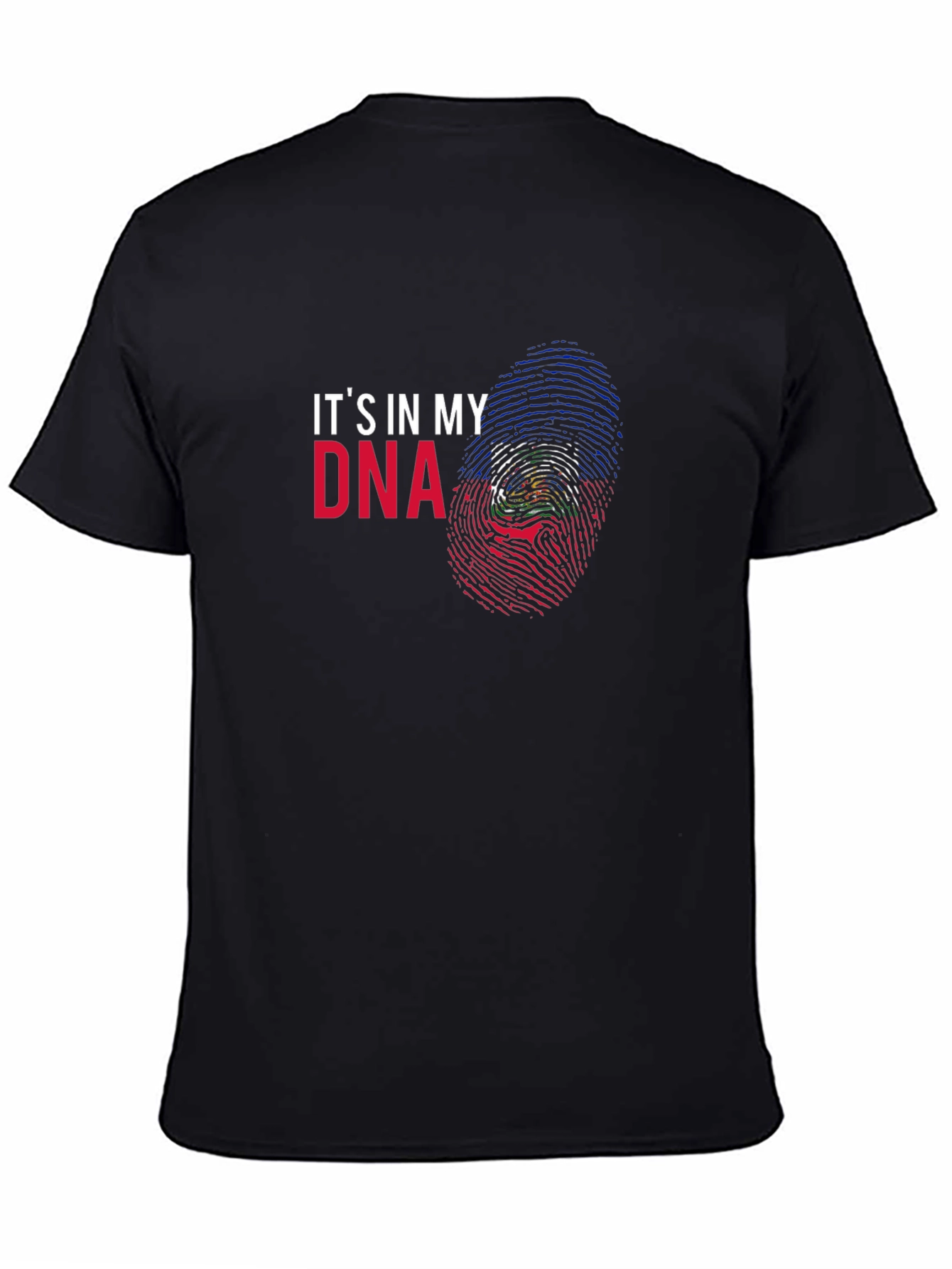 Show off your heritage with this unique graphic tee. This black t-shirt features a bold print that reads "It's In My DNA" alongside a fingerprint design in the colors of the Haitian flag. The design is eye-catching and makes a statement, perfect for everyday wear or special occasions. Made from comfortable materials, this tee is great for casual outings, cultural events, or as a thoughtful gift for someone proud of their Haitian roots. Embrace your heritage and make a statement with this unique and stylish tee.